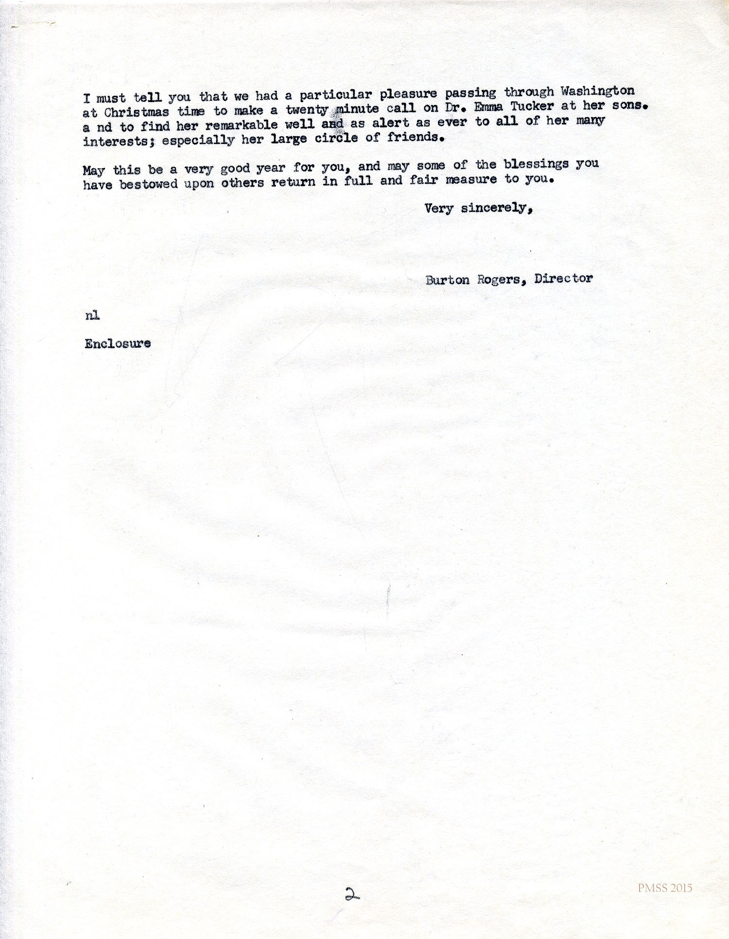 [no date, no salutation] I must tell you that we had a particular pleasure passing through Washington at Christmas time to make a twenty minute call on Dr. Emma Tucker at her sons and to find her remarkably well and as alert as ever to all of her many interests; especially her large circle of friends. Very sincerely, [unsigned] Burton Rogers, Director nl Enclosure
