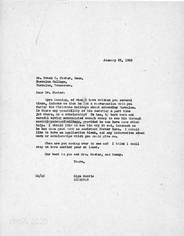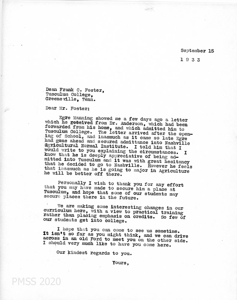 | 1933-09-15 | Glyn Morris to Frank G. Foster regarding Egre Manning. Morris notes that Manning received an acceptance letter from Tusculum but the letter arrived after Manning received admittance to Nashville Agricultural Normal Institute. Morris is writing for Manning who explained that his decision was based on his desire to major in agriculture and Nashville was a better program. Manning expressed gratitude through Morris for the Tusculum consideration. Discussion by Morris on the changes to PMSS curriculum toward “practical training” * | 005 |