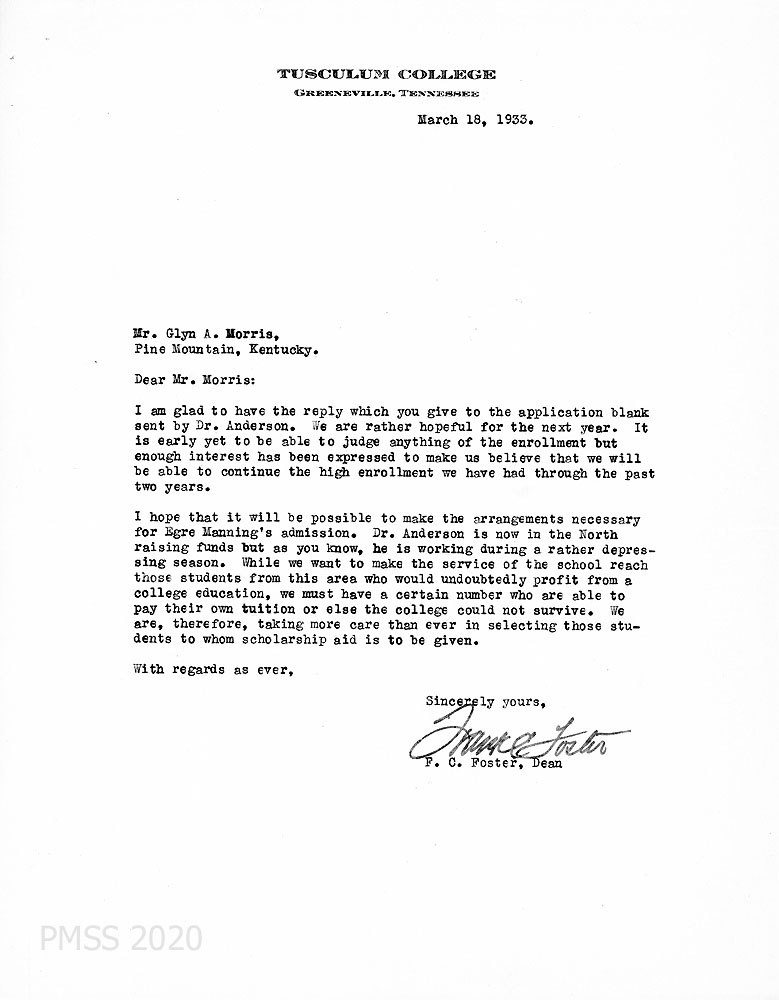 | 1933-03-18 | Frank C. Foster to Glyn Morris regarding his request to provide assistance in enrollment of Egre Manning in Tusculum College. Offers hope but no confirmation of assistance.” | 002 |