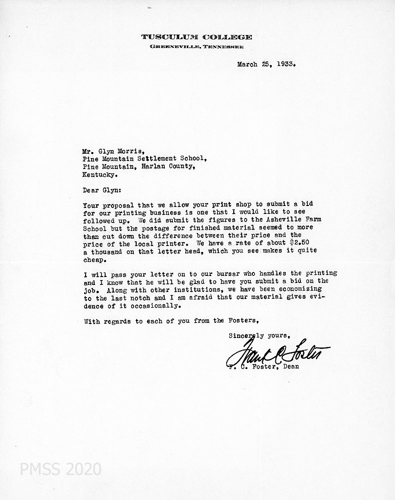 | 1933-03-25 | Frank C. Foster to Glyn Morris regarding a potential bid on printing for Tusculum. The Asheville Farm School had been contacted but the cost of mailing their finished product ate into the reduced price for their work. Foster agrees to send information about PMSS printing to their bursar. He notes that the cost of letterhead stationery for Tusculum is $2.50 per 1000. * | 004 |