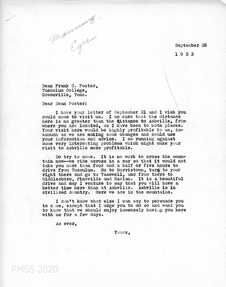 | 1933-09-25 | Morris to Frank C. Foster. Tusculum College requesting a visit to PMSS in order to consult. Morris says it is a better trip to PMSS than it is to Ashville [sic]. Morris says, “It is a beautiful drive, and may I venture to say that you will have a better time here than at Ashville. Ashville is in civilized country. Here we are in the mountains.” | 006 |