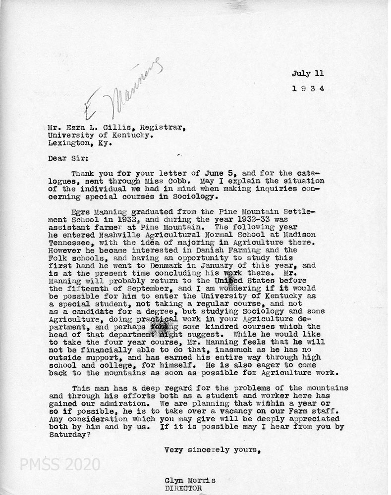 | 1934-07-11 | Glyn Morris to Ezra L. Gillis, Registrar, University of Kentucky, Lexington, Ky. Gives an introduction to Egre Manning and asks for consideration and assistance for him to take special courses in sociology, explaining that Manning’s interests shifted following a brief stay in Denmark to Folk School culture and agriculture. | 007 |