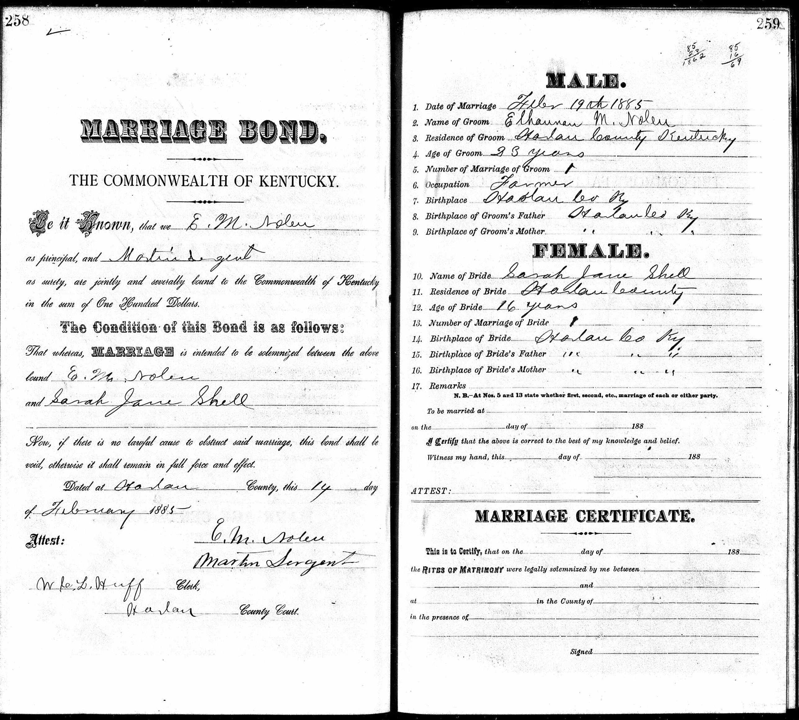 - Marriage Bond for Elhannon Nolan and Sara Jane Shell, February 19, 1885.[pmss_nolan_em_marriage_cert.jpg]