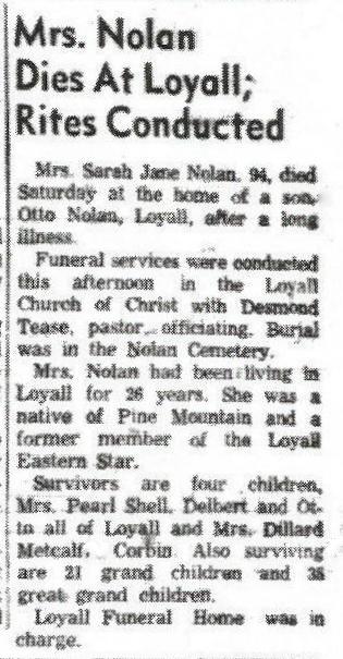 Survivors include his wife; two sons, Otto Nolan and Delbert Nolan, Pine Mountain; two daughters, Mrs. Pearl Shell and Mrs. Dillard Metcalf, Loyall; and 20 grandchildren.