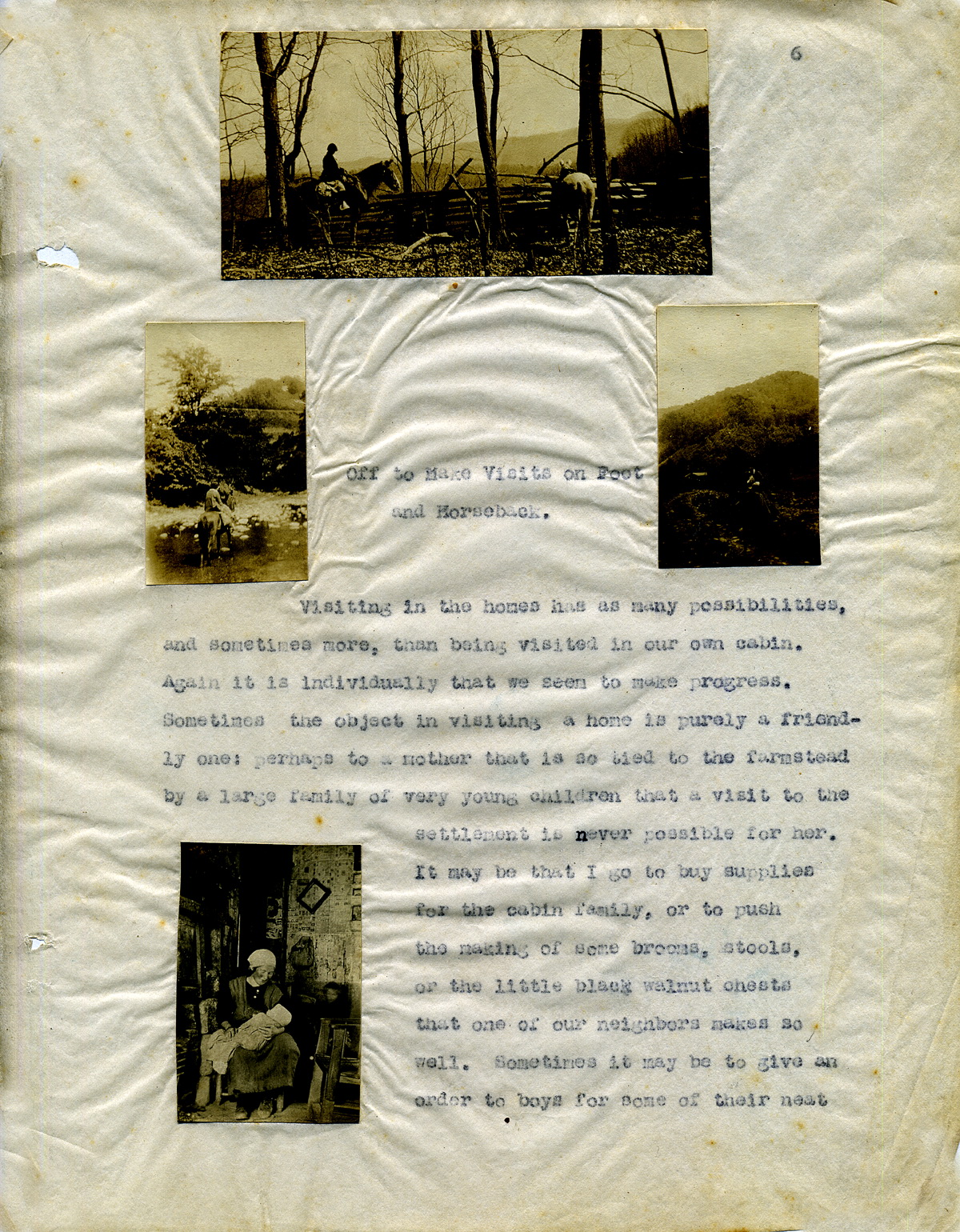 Visiting in the homes has many possibilities, and sometimes more, than being visited in our own cabin. Again it is individually that we seem to make progress. Sometimes the object in visiting a home is purely a friendly one; perhaps to another that is so tied to the farmstead by a large family of very young children that a visit to the settlement is never possible for her. It may be that I go to buy supplies for the cabin family, or to push the making of some brooms, stools, or the little black walnut chests that one of our neighbors makes, as well. Sometimes it may be to give an order to boys for some of their neat “fatty pine” bundles for the fires of far away friends.