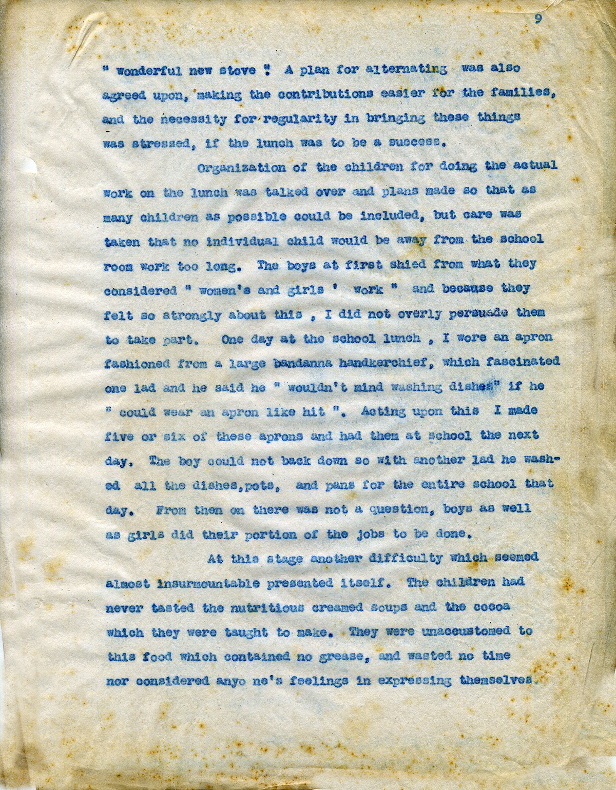 Organization of the children for doing the actual work on the lunch was talked over and plans made so that as many children as possible could be included, but care was taken that no individual child would be away from what they considered “women’s and girl’s work” and because they felt so strongly about this, I did not overly persuade them to take part. One day at the school lunch, I wore an apron fashioned from a large bandanna handerkchief, which fascinated one lad and he said he “wouldn’t mind dishes” if he “could wear an apron like hit.” Acting upon this I made five or six of these aprons and had them at school the next day. The boy couldn’t back down so with another lad he washed all the dishes, pots, and pans for the entire school that day. From then on there was not a question; boys as well as girls did their portion of the jobs to be done.