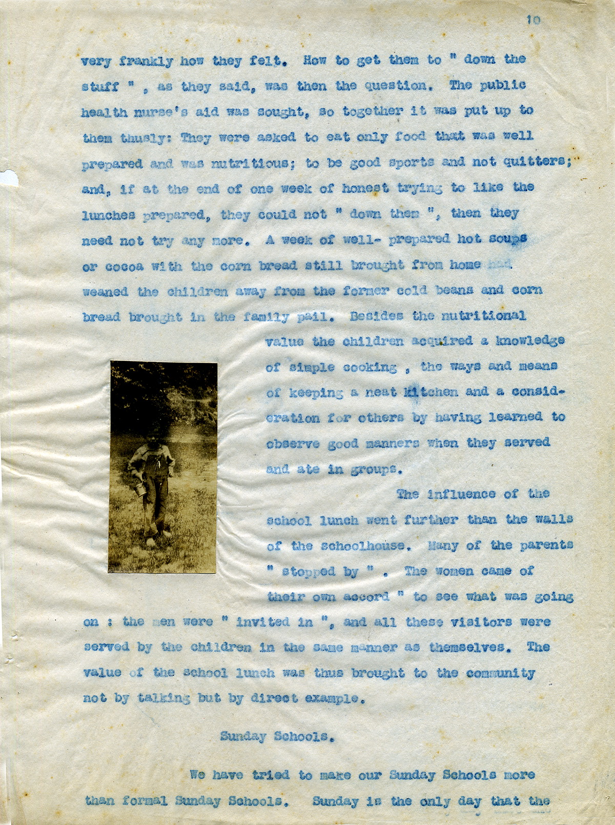 The first real bit of cooperation was realized in the hot school lunches in one of the nearer public schools. Ten dollars had been given by an interested group of outside people for the necessary permanent equipment. First came the question of making the parent realize the benefits, even in the vaguest way, of a hot school lunch, so they would permit their children, who were for the most part eager to cooperate, to bring the necessary food supplies to make it a going proposition. Some of the objections interposed were: “We never had no sech like when we went to school” ; one father ” ‘lowed as how” he had always given his “younguns” all the “victuals” they needed and he “reckoned” he could keep on doing so; another parent seemed offended in a way that “someone else” had to cook for his children, and other similar remonstrances. After much discussing and explaining, the real underlying reasons for promoting hot school lunches and the benefits that could be derived from them, the parents were more or less won over and agreed to do what they could.