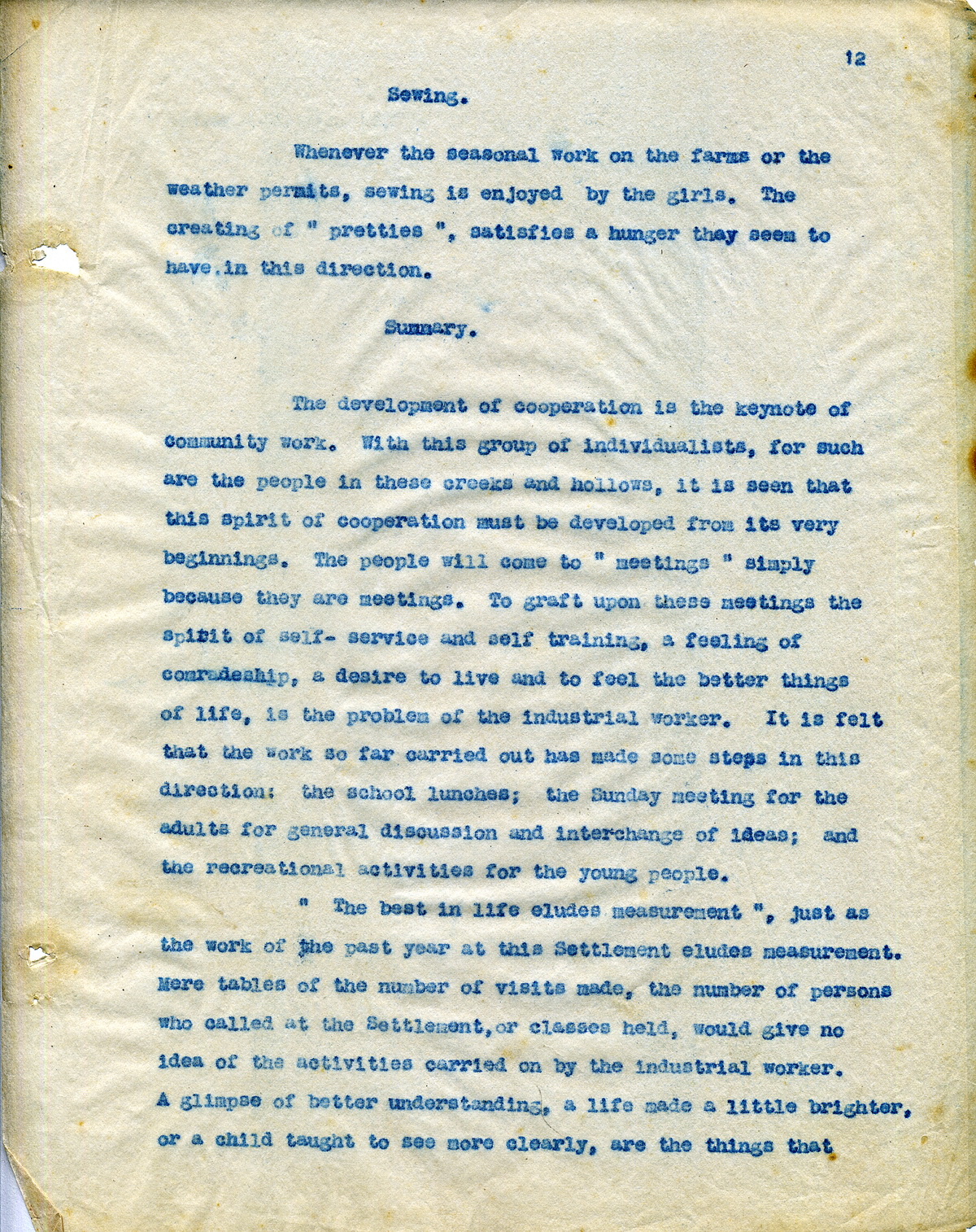 “The best in life eludes measurement,” just as the work of the past year at this settlement eludes measurement. Mere tables of the number of visits made, the number of persons who called at the Settlement, or classes held, would give no idea of the activities carried on by the Industrial Worker. A glimpse of better understanding, a life made a little brighter, or a child taught to see more clearly, are the things that count, but mean little on paper.