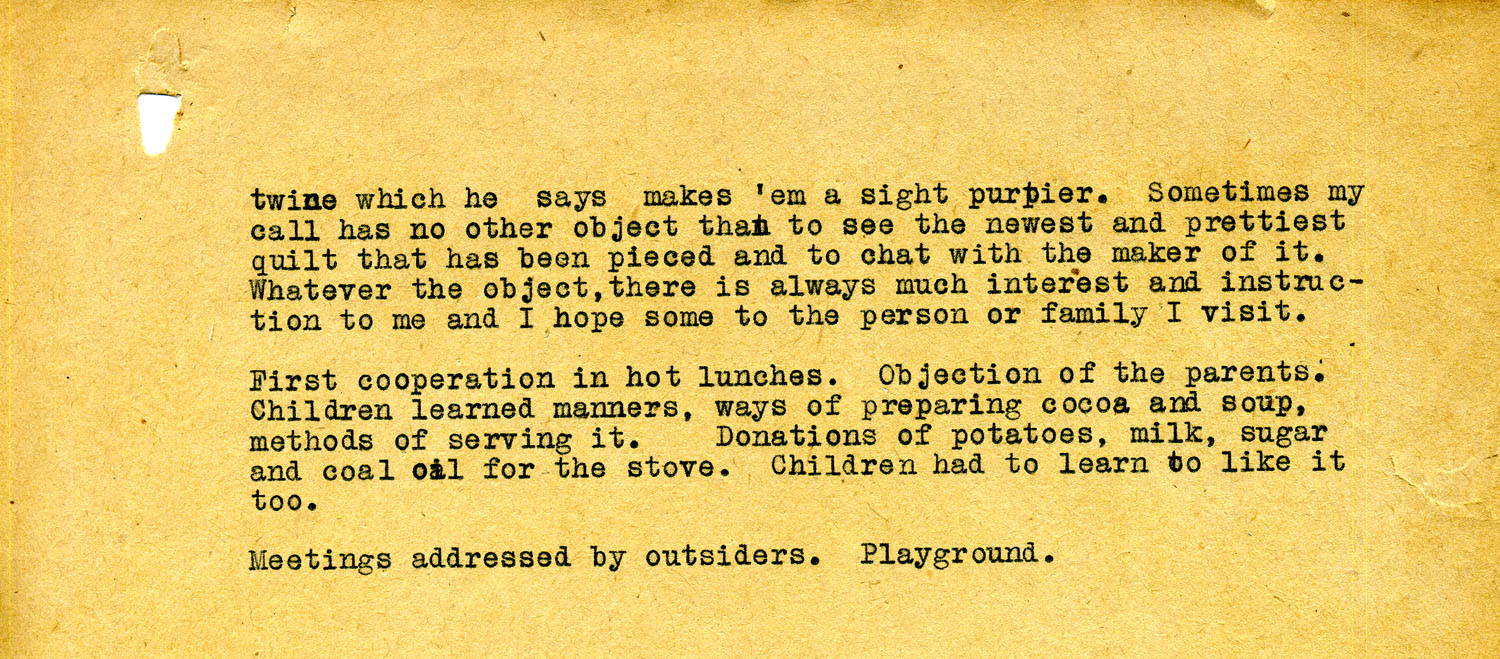 First cooperation is hot lunches. Objection of the parents. Children learned manners, ways of preparing cocoa and soup, methods of serving it. Donations of potatoes, milk, sugar and coal oil for the stove. Children had to learn to like it too.