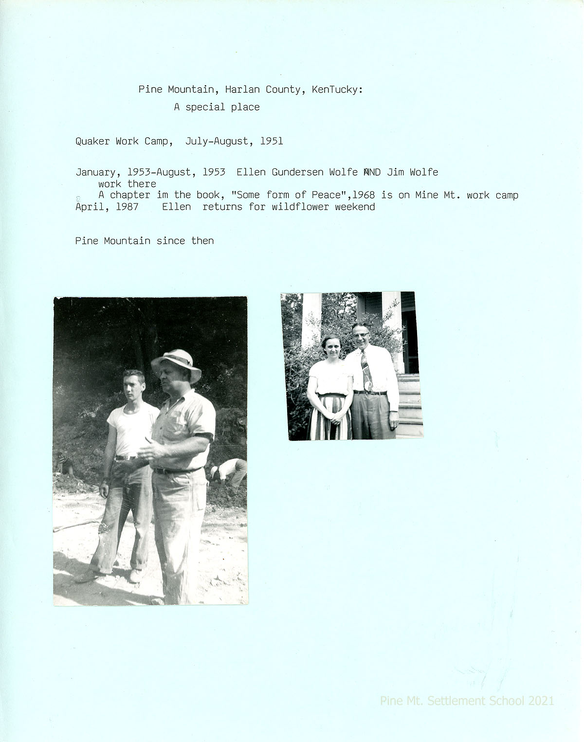 3. “Pine Mountain, Harlan County, Kentucky: A special place. Quaker Work Camp, July- August, 1951. January, 1953-August, 1953 Ellen Gundersen and Jim Wolfe work there.