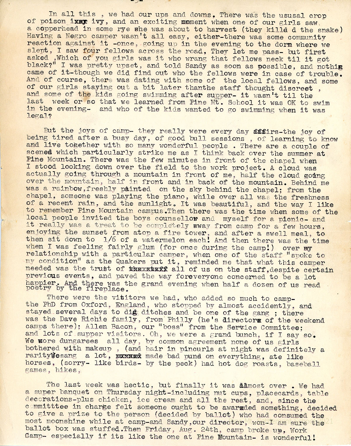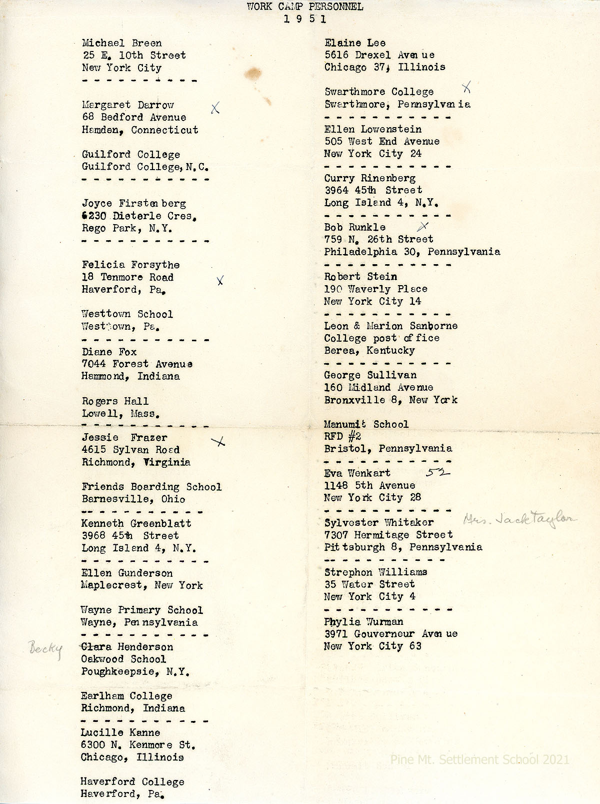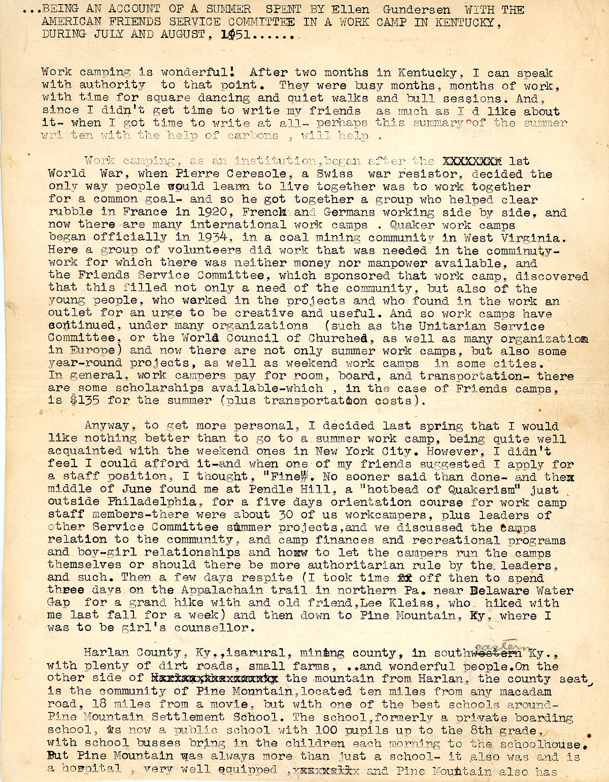 4. Ellen Gundersen, “Being an Account of a Summer Spent by Ellen Gundersen with the American Friends Service Committee in a Work Camp in Kentucky, during July and August, 1951 …” (4 page memoir with list of workers in the 1951 Camp)