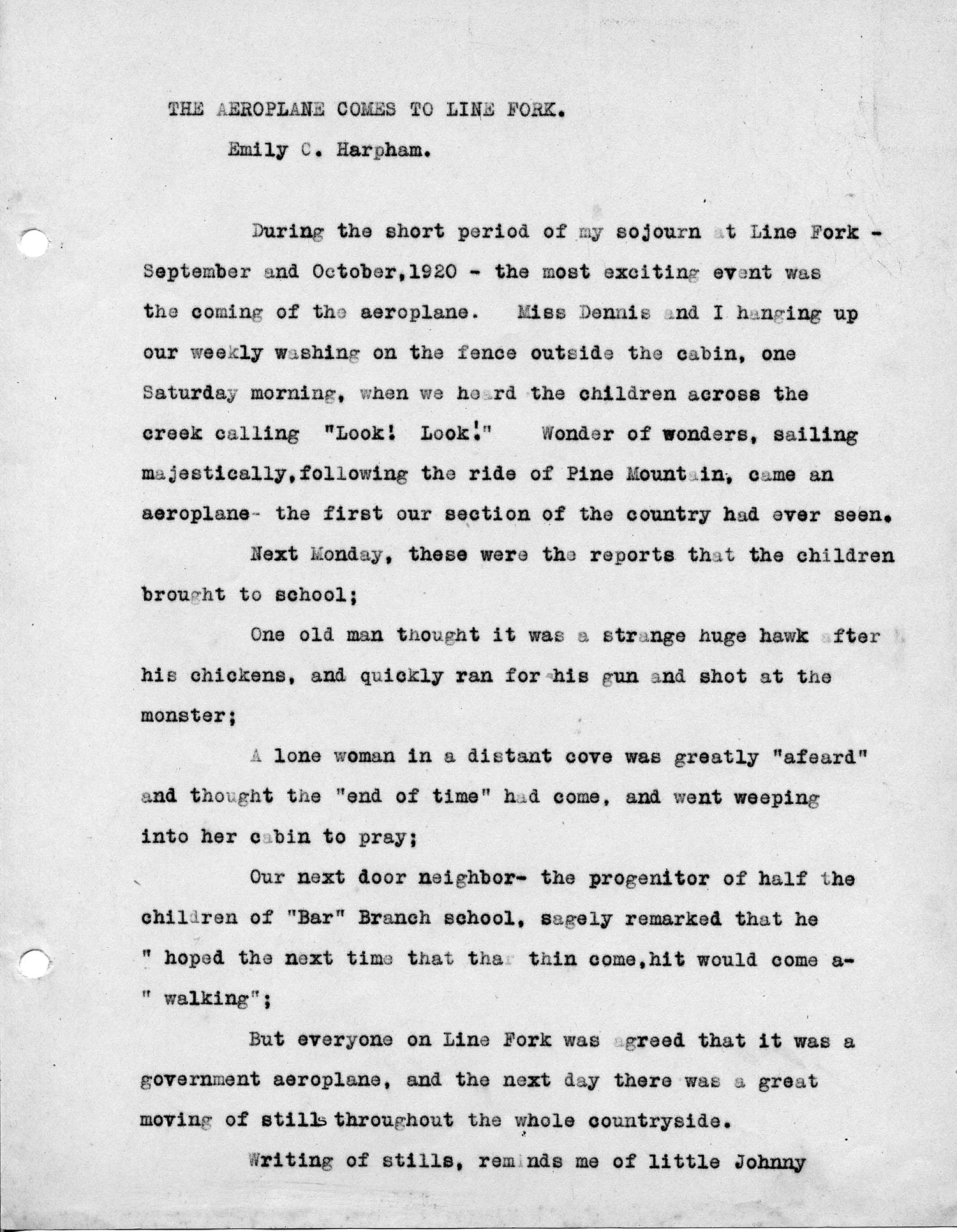 Harpham, Emily C. “The Aeroplane Comes to Line Fork.” Narrative. Series 09: BIOGRAPHY – Staff. Pine Mountain Settlement School Institutional Papers, Pine Mountain, KY. Archival material.