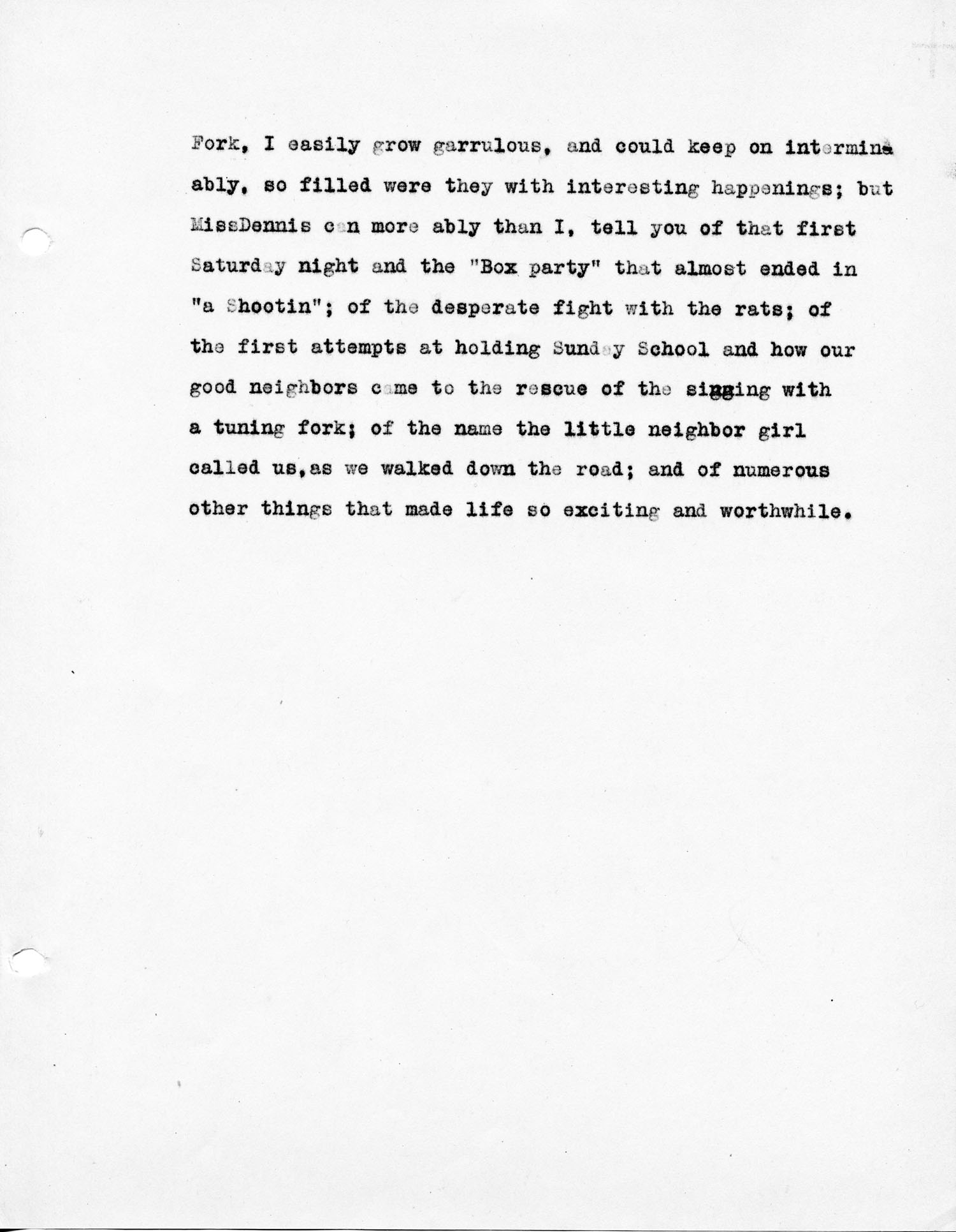 Fork, I easily grow garrulous, and could keep on interminably, so filled were they with interesting happenings; but Miss Dennis can more ably than I, tell you of that first Saturday night and the “Box party” that almost ended in “a Shootin”; of the desperate fight with the rats; of the first attempts at holding Sunday School and how our good neighbors came to the rescue of the singing with a tuning fork; of the name the little neighbor girl called us, as we walked down the road; and of numerous other things that made life so exciting and worthwhile.