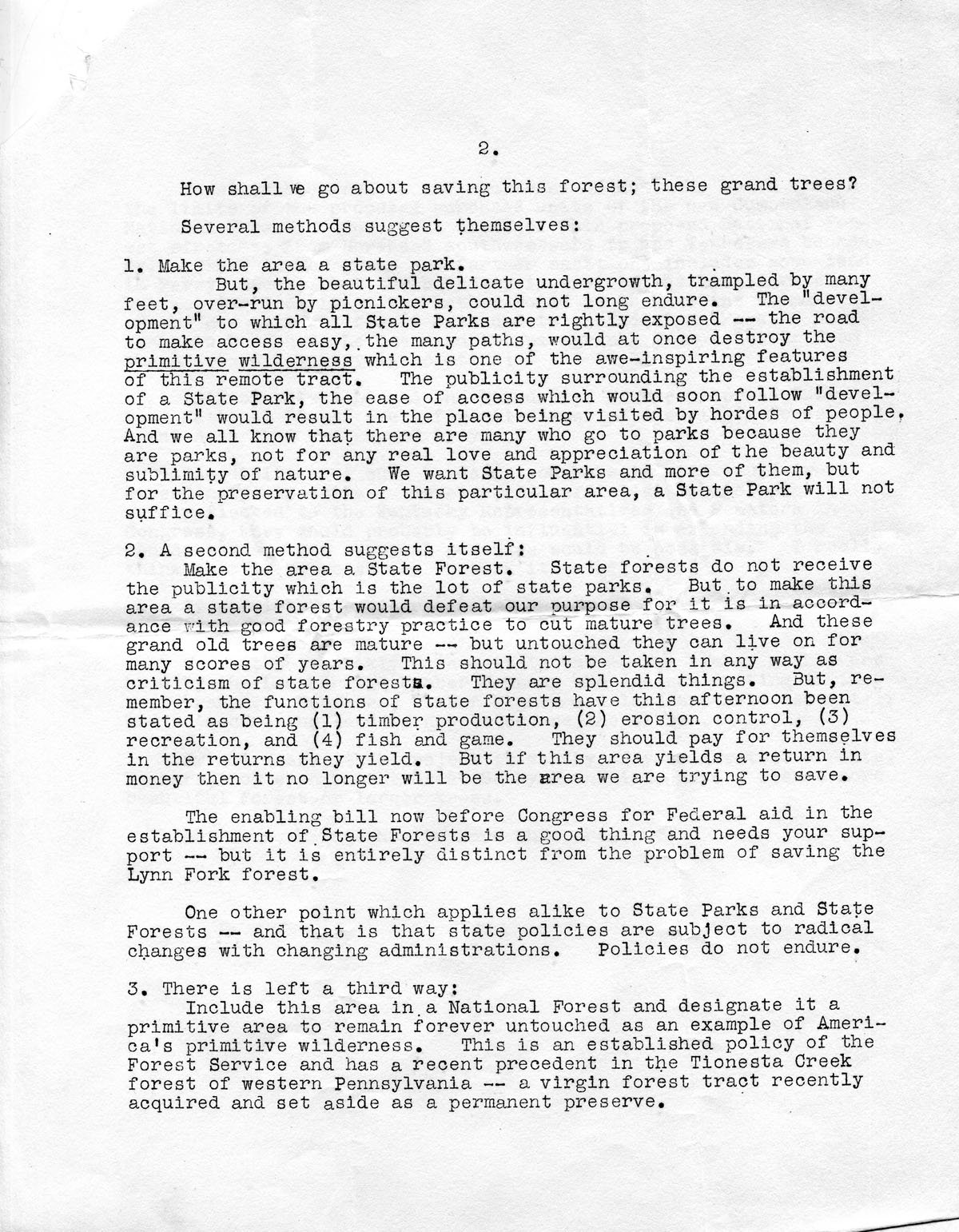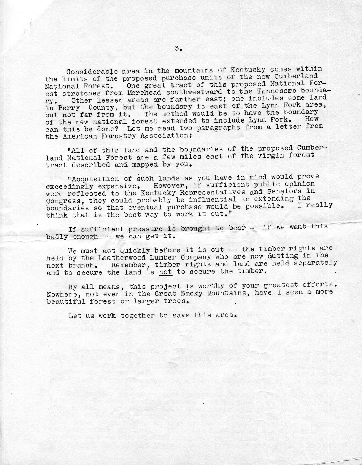 Down in the southern part of Perry County, on Lynn Fork of Leatherwood Creek, is one of the most beautiful tracts of virgin forest I have ever seen. For some time, I had heard of the Big Poplar of Perry County, and it was while on the quest for this that I saw this magnificent forest. It occupies the Left Fork of Lynn Fork, and for some two miles, we walked through untouched forest, following a faint trail which led to the Big Poplar, a gigantic tulip tree nearly 24 feet in circumference. It took five people with arms outstretched to reach around the tree. This gigantic trunk towered upward, unbranched, to such heights that it was impossible to distinguish the leaves of the crown. Nowhere east of California have I seen such a gigantic tree. And this was only one of many large trees. This forest contains a variety of trees — tulip poplar, oaks, beech, sugar maple, hemlock, all large. Often times we see tracts of so-called virgin forests, from which this or that tree has been removed or if the canopy is intact, with the undergrowth ruined by grazing or by rooting hogs; but not so here. Nothing had been disturbed; the luxuriance of the undergrowth is beyond description. There is a wealth of herbaceous plants, and beautiful wildflowers everywhere. The whole place is awe-inspiring in its beauty and grandeur . . . Very few virgin forest areas remain. Of the original forest of Kentucky, less than two percent remains in such conditions that it can be classified as old-growth; and only a small part of this is really virgin. The Lynn Fork is one of these . . . Nowhere in the whole world is there the equal in beauty and magnificence of our eastern deciduous forest. It is unexcelled. And in Kentucky and Tennessee, this deciduous forest reached its superlative development. By saving a piece of Kentucky’s virgin forest, you would be saving a forest outstanding of its kind . . . We must act quickly before its cut-the-timber rights are held by the Leatherwood Lumber Company, who are now cutting in the next branch . . . By all means, this project is worthy of your greatest effort. Nowhere, not even in the Great Smoky Mountains, have I seen a more beautiful forest or larger trees. Let us work together to save this area…