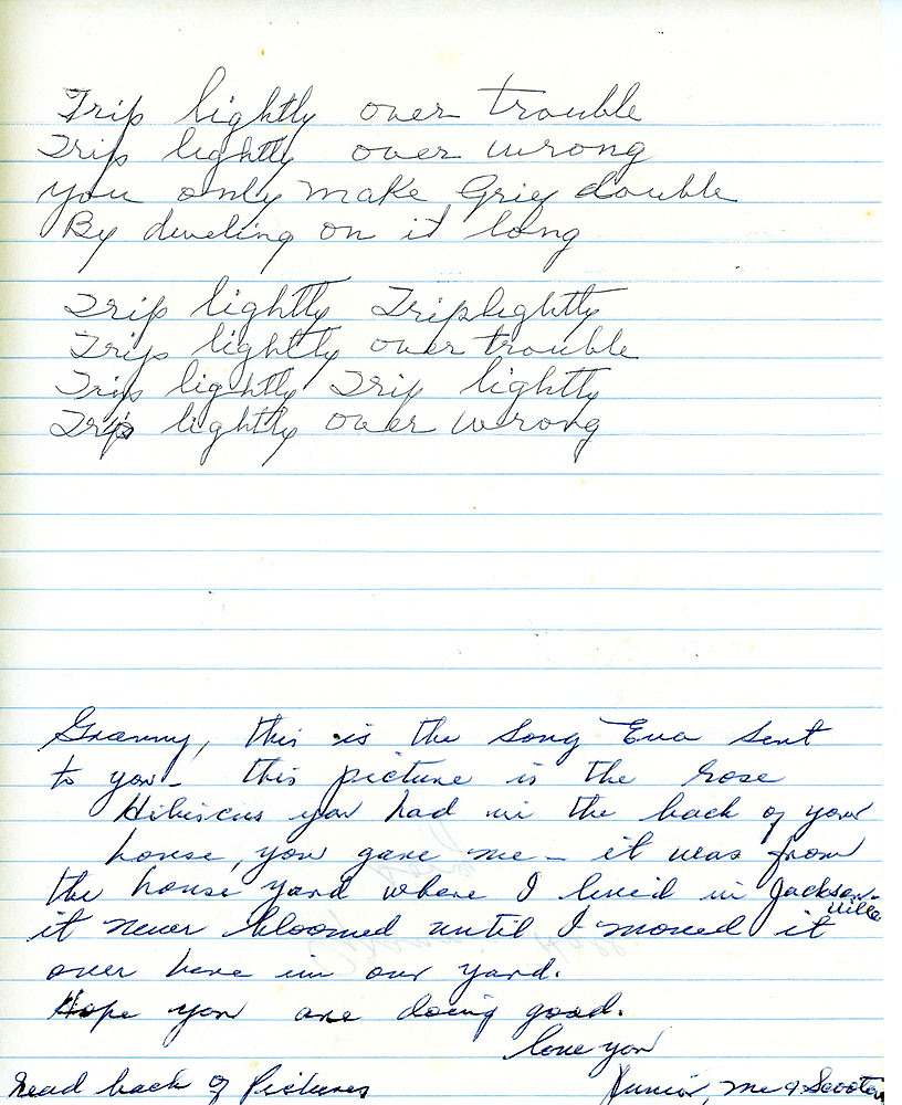 Granny and Grandpa moved to Florida about 1969 near their son. Their marriage ended after 63 years with the death of Grandpa. Granny continues to live in Florida with her sister but has spent time staying with her daughters during the summers.