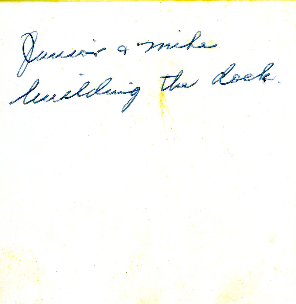 - Junior [E.C Hall II] and Mike building the dock.” Photo in letter from Enoch C. Hall II to his mother, Myrtle Hall 1984. [hall_enoch_III_letter_005]