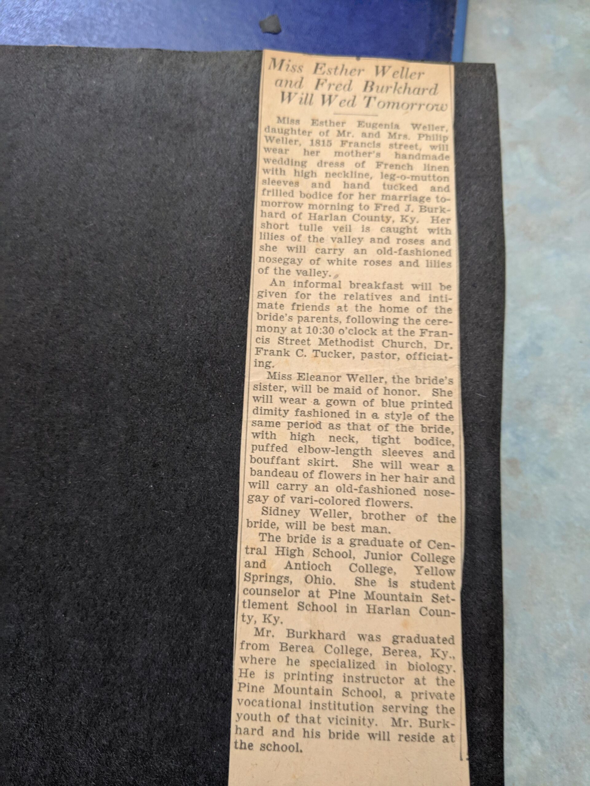 [IMG-20210305-113905.jpg] [Newspaper clipping, undated, unidentified source.] “Miss Esther Weller and Fred Burkhard Will Wed Tomorrow.”