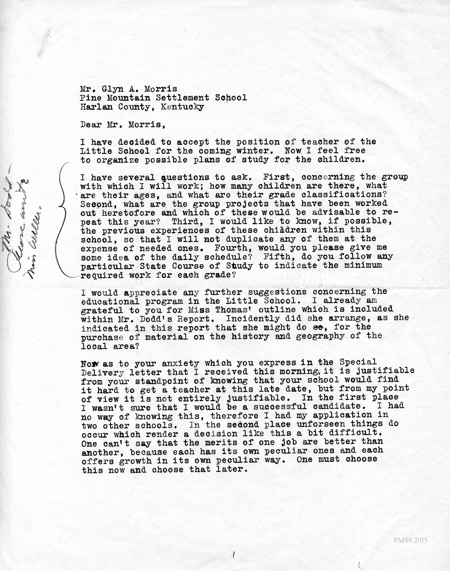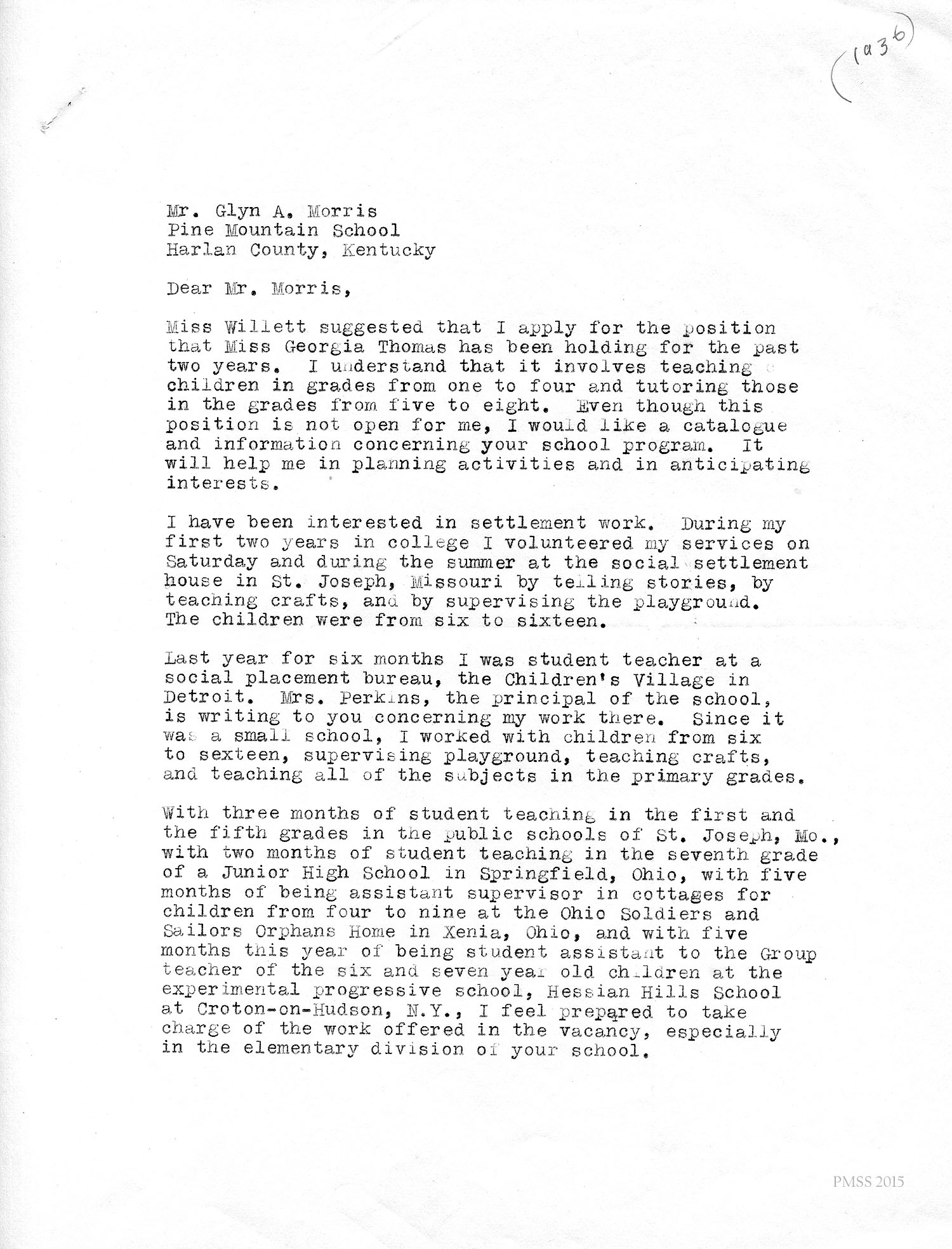 Miss Willett suggested that I apply for the position that Miss Georgia Thomas has been holding for the past two years. I understand that it involves teaching children in grades from one to four and tutoring those in the grades from five to eight. Even though this position is not open for me, I would like a catalogue and information concerning your school program. It will help me in planning activities and in anticipating interests.