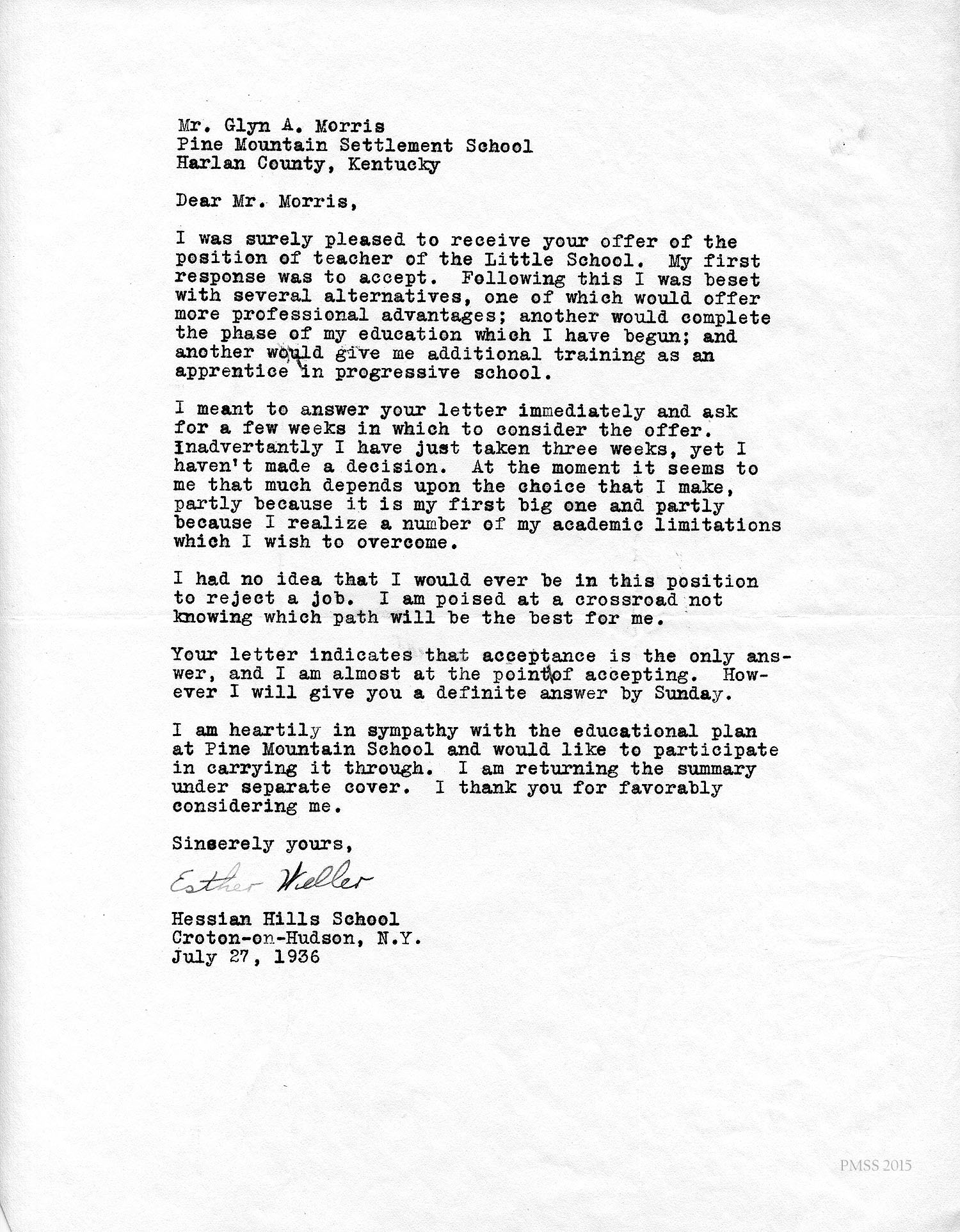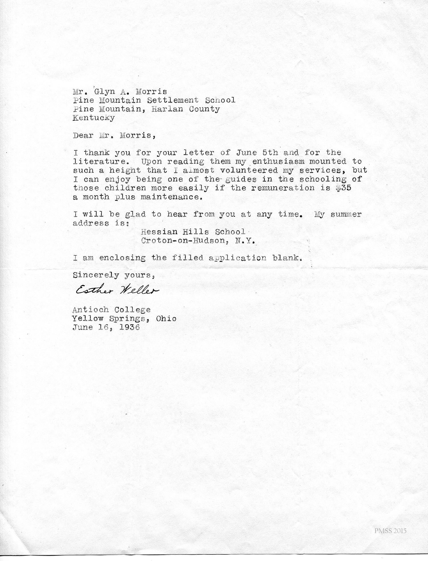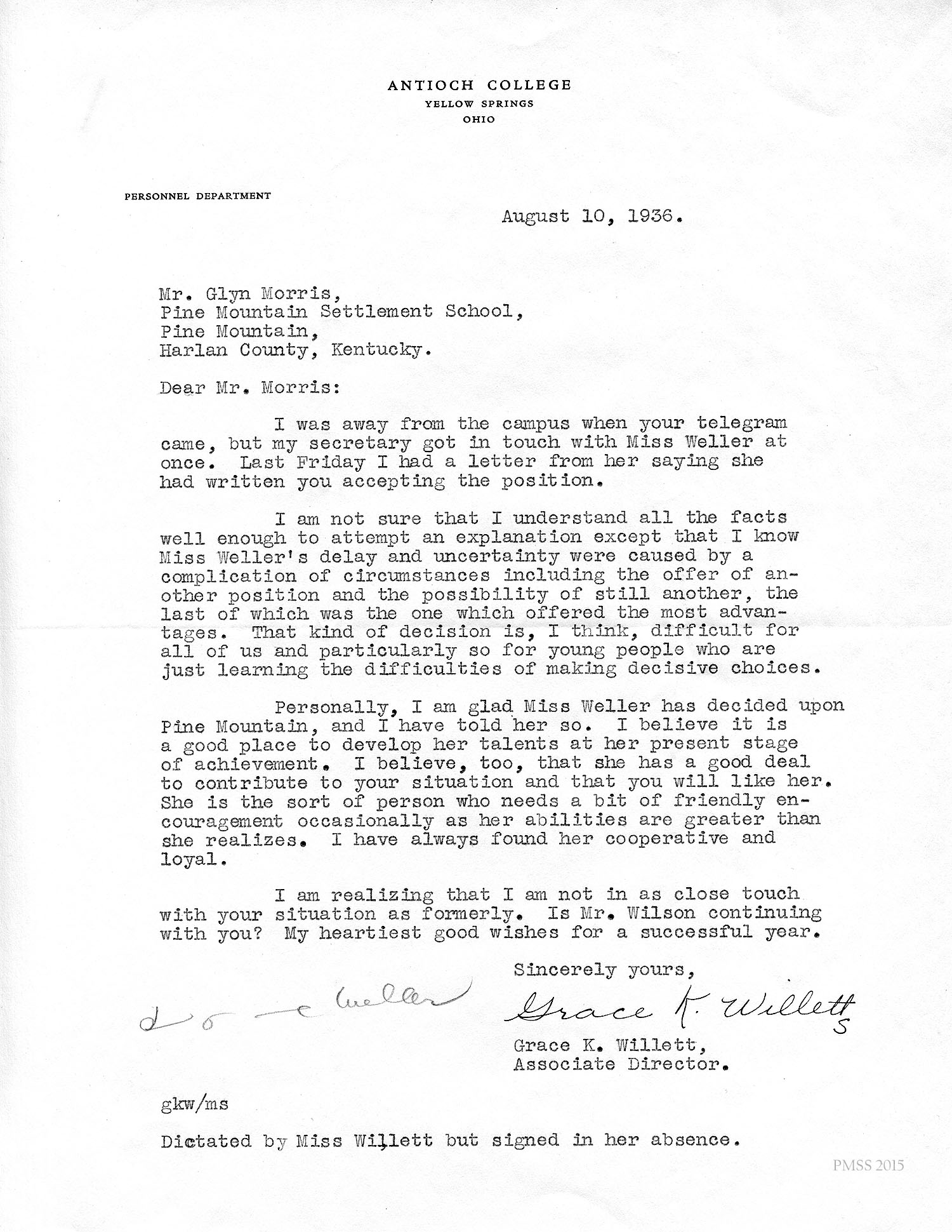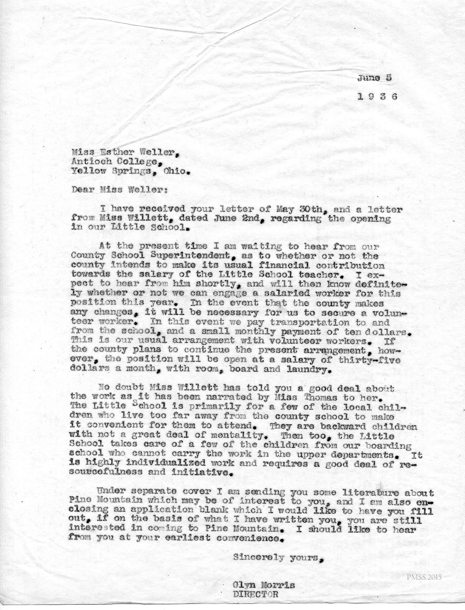 I am enclosing the credentials for Esther Weller, one of our senior girls who is applying for Georgia Thomas’s position at Pine Mountain. You will notice that Miss Weller has had a varied experience on her co-operative work. All of these positions, at the Ohio Soldiers’ and Sailors’ Orphans’ Home, and the Children’s Village, and Hessian Hills, have been with children. She has worked with children from kindergarten age through sixth and seventh grades. Her training at St. Joseph Junior College, which was largely in education, dealt with junior high school work. She has, therefore, had a good variety of background and training for such a position as you have to offer at Pine Mountain.