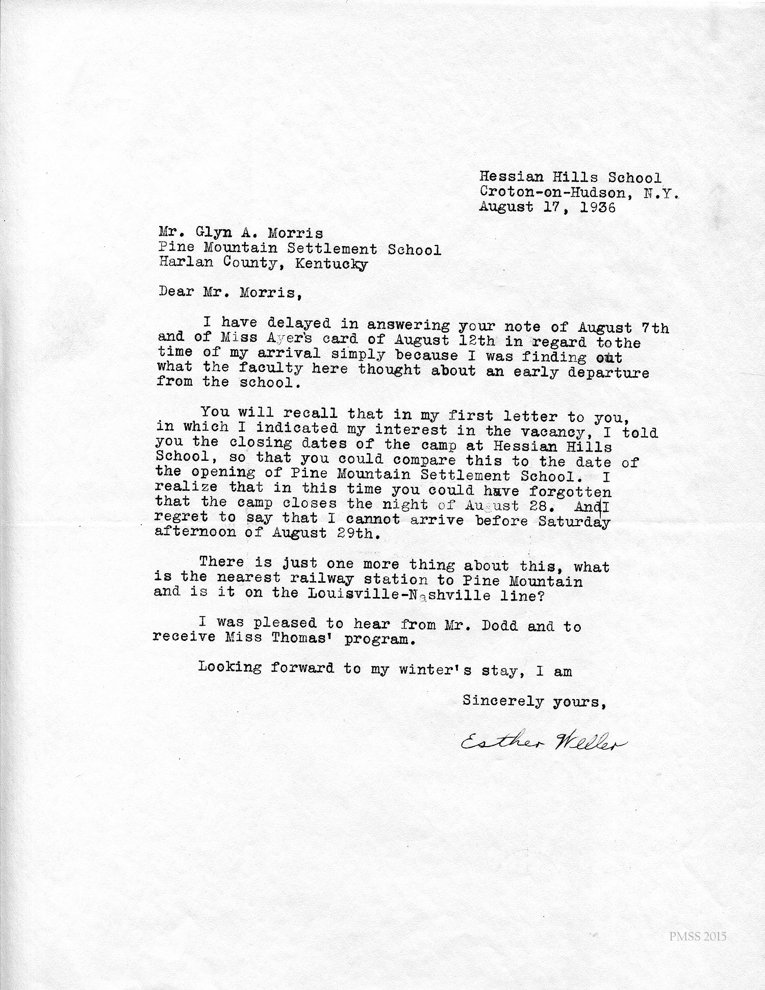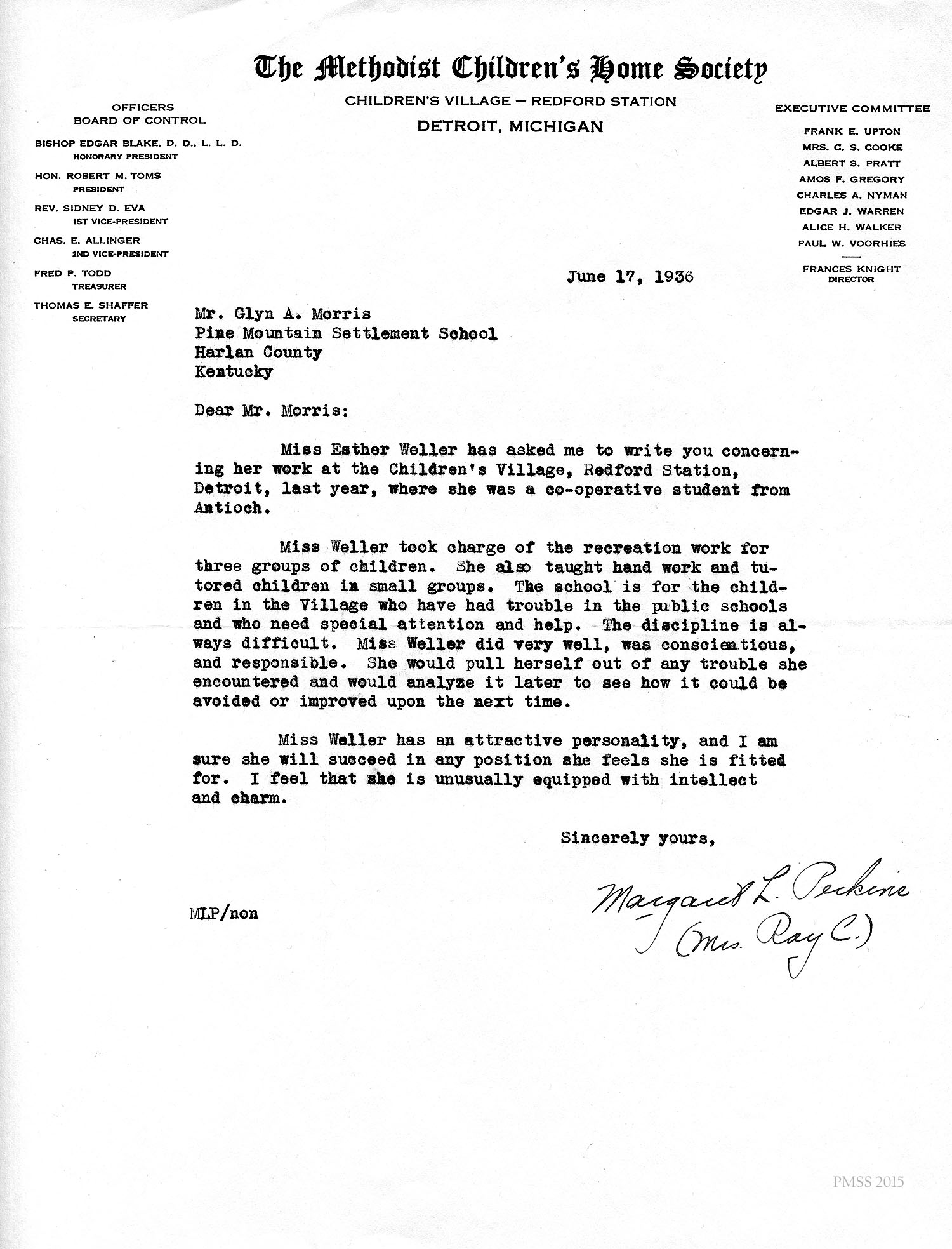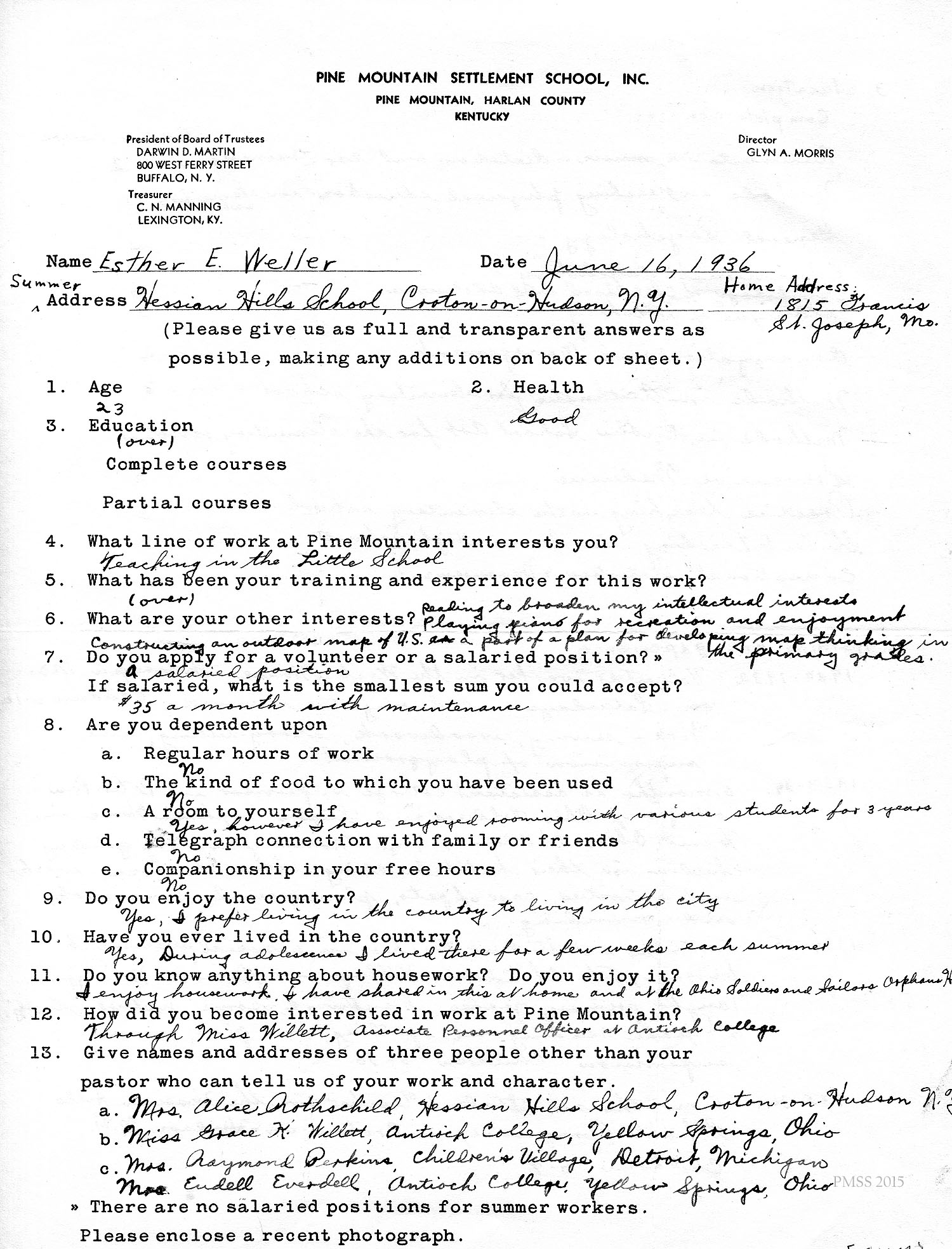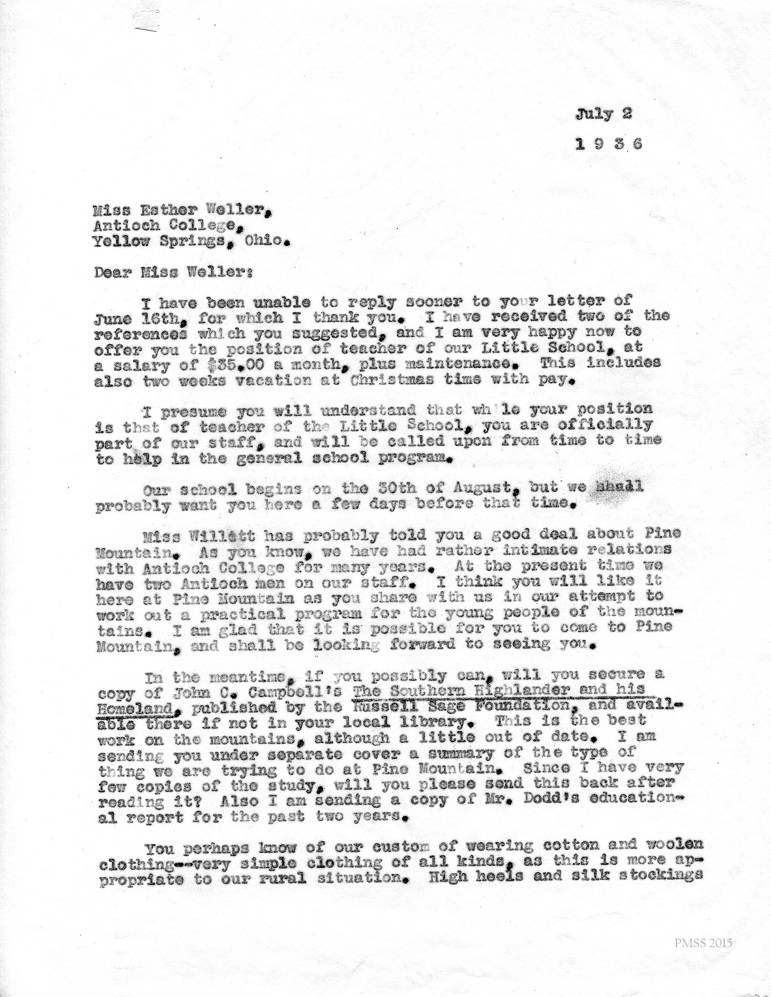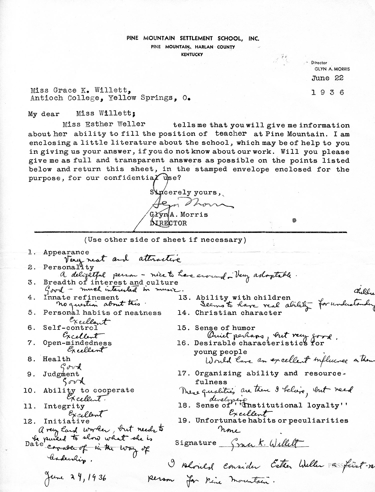 I am enclosing the credentials for Esther Weller, one of our senior girls who is applying for Georgia Thomas’s position at Pine Mountain. You will notice that Miss Weller has had a varied experience on her co-operative work. All of these positions, at the Ohio Soldiers’ and Sailors’ Orphans’ Home, and the Children’s Village, and Hessian Hills, have been with children. She has worked with children from kindergarten age through sixth and seventh grades. Her training at St. Joseph Junior College, which was largely in education, dealt with junior high school work. She has, therefore, had a good variety of background and training for such a position as you have to offer at Pine Mountain.