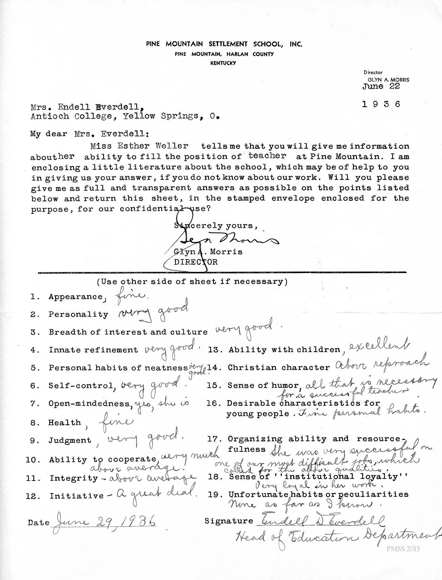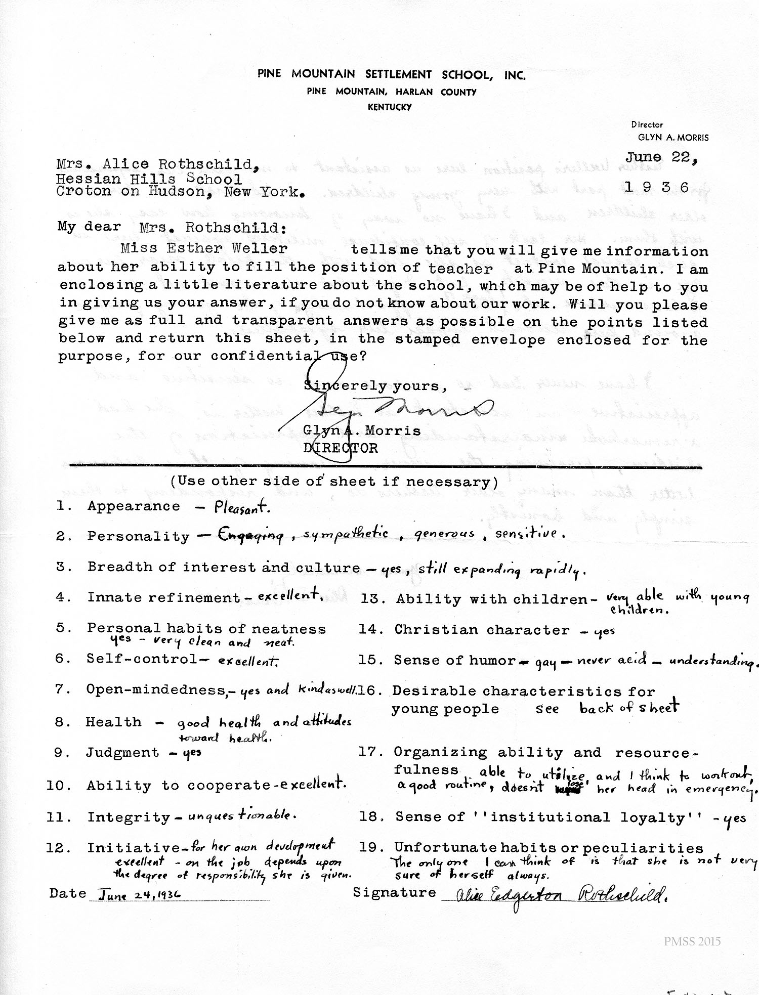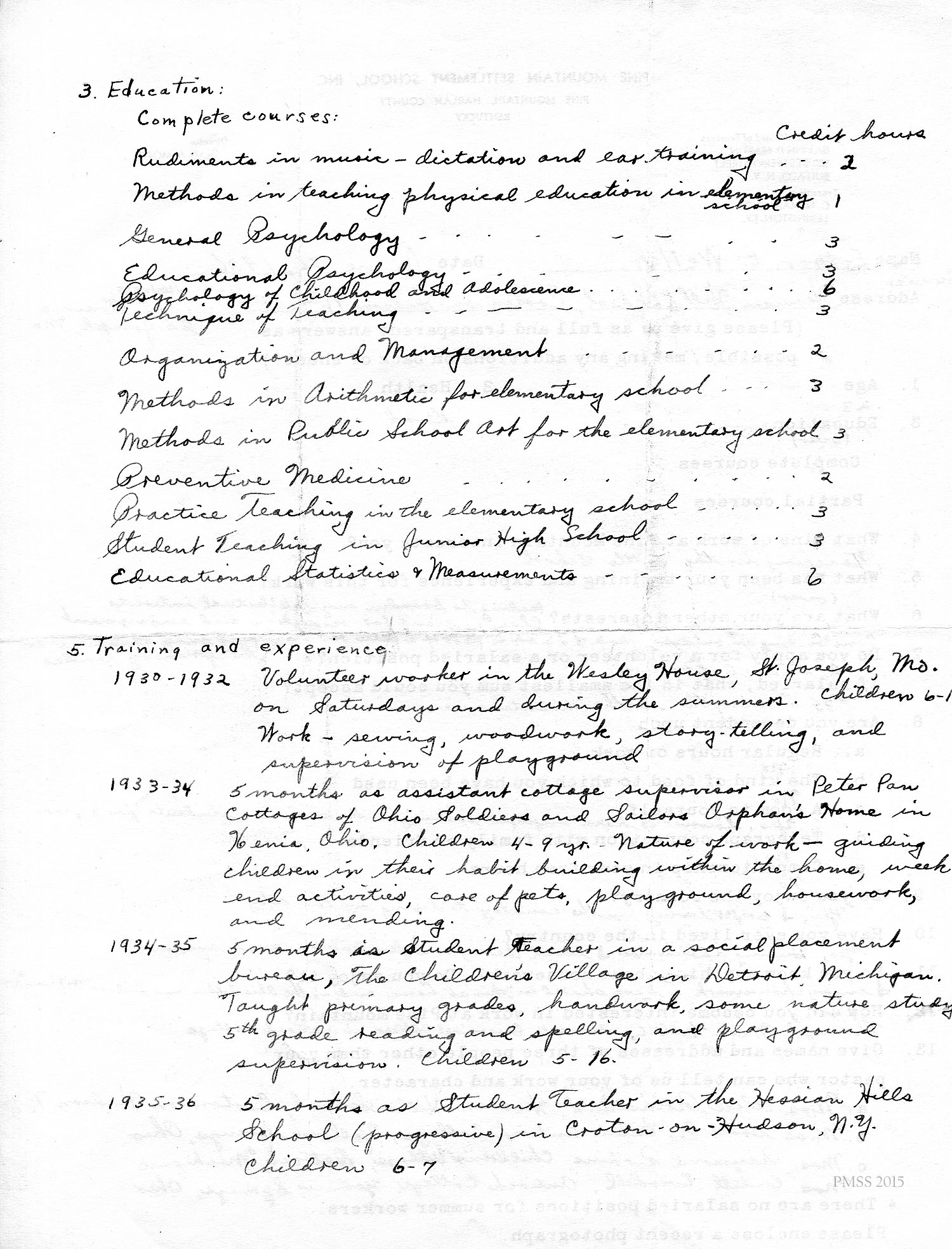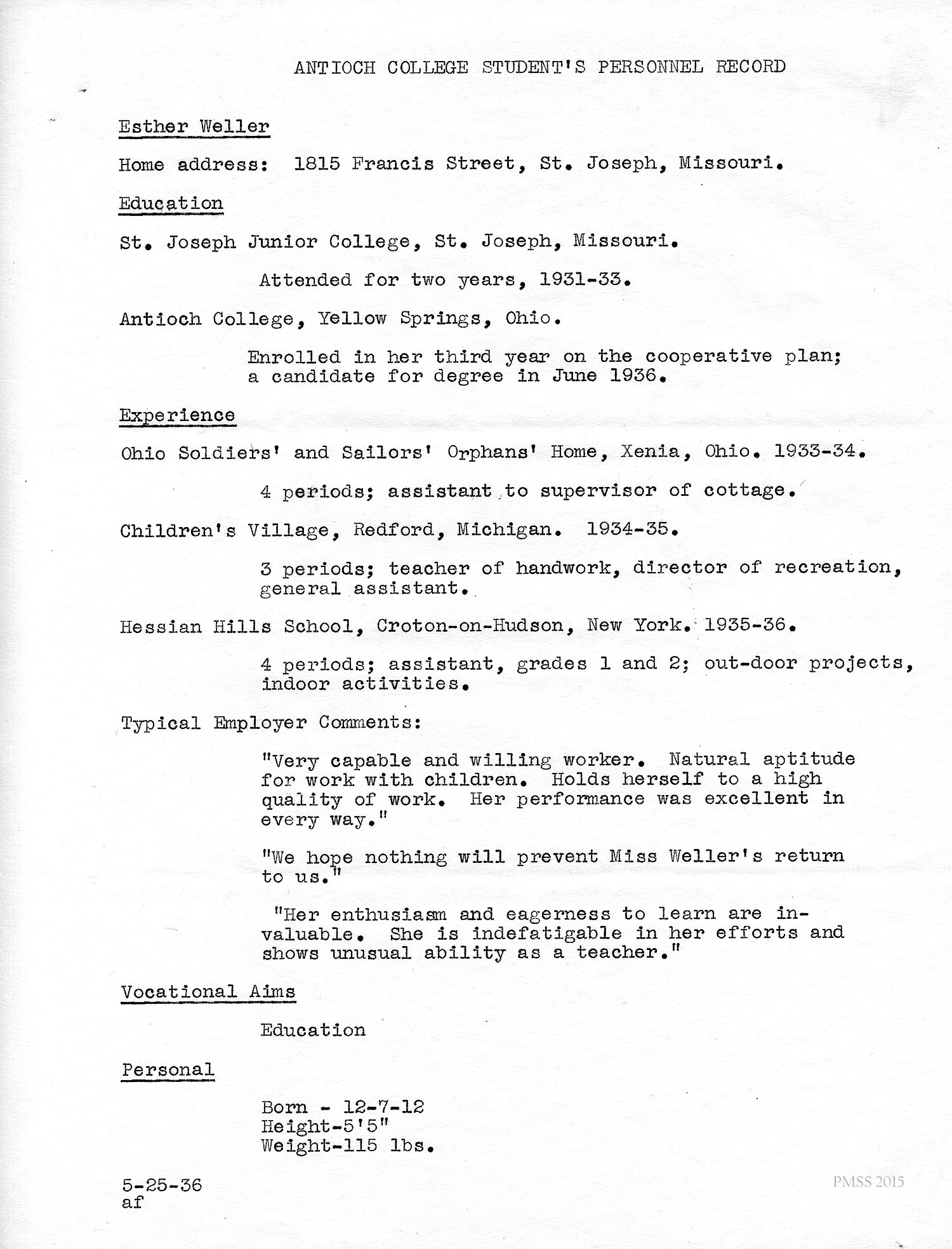 I am enclosing the credentials for Esther Weller, one of our senior girls who is applying for Georgia Thomas’s position at Pine Mountain. You will notice that Miss Weller has had a varied experience on her co-operative work. All of these positions, at the Ohio Soldiers’ and Sailors’ Orphans’ Home, and the Children’s Village, and Hessian Hills, have been with children. She has worked with children from kindergarten age through sixth and seventh grades. Her training at St. Joseph Junior College, which was largely in education, dealt with junior high school work. She has, therefore, had a good variety of background and training for such a position as you have to offer at Pine Mountain.