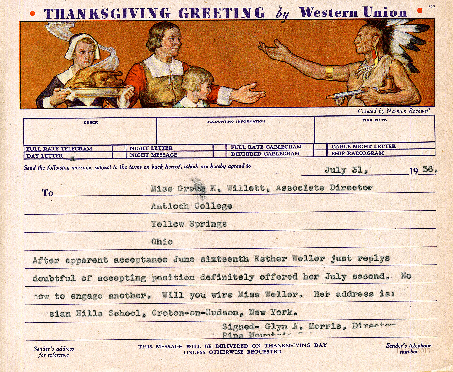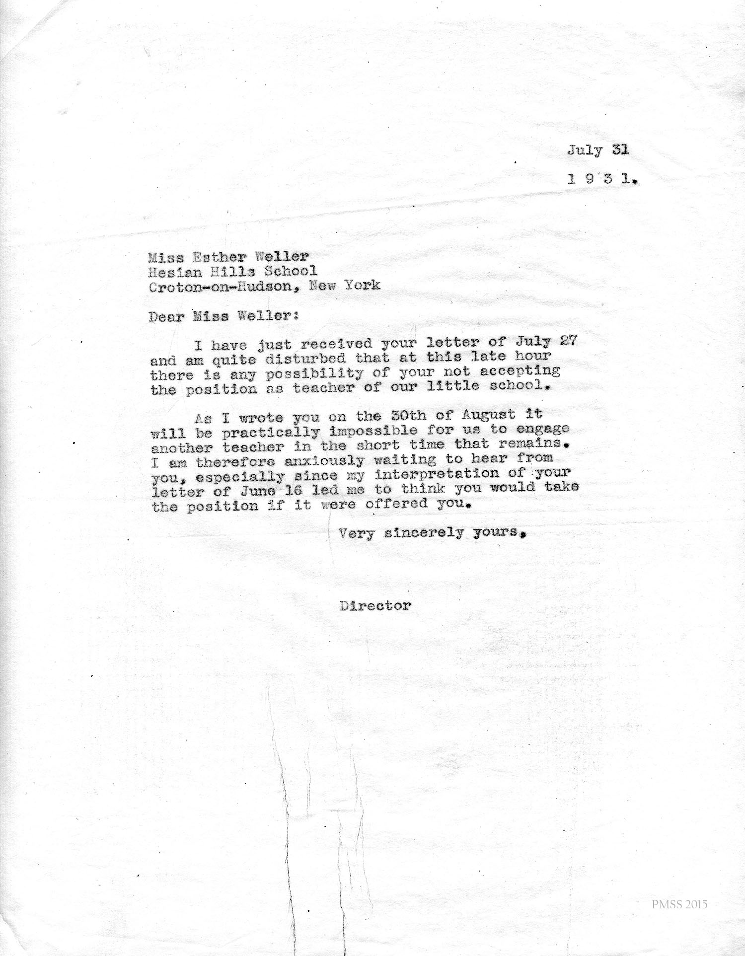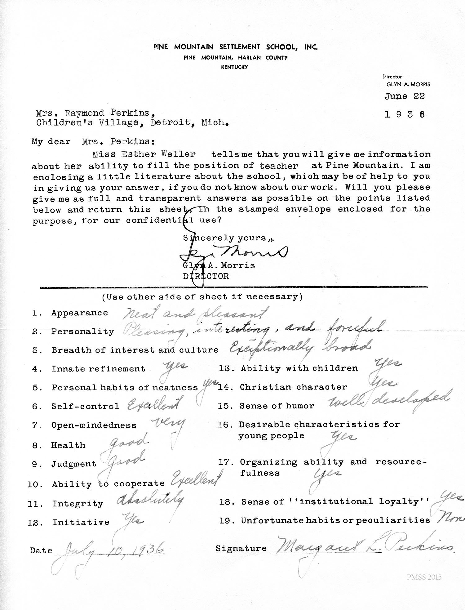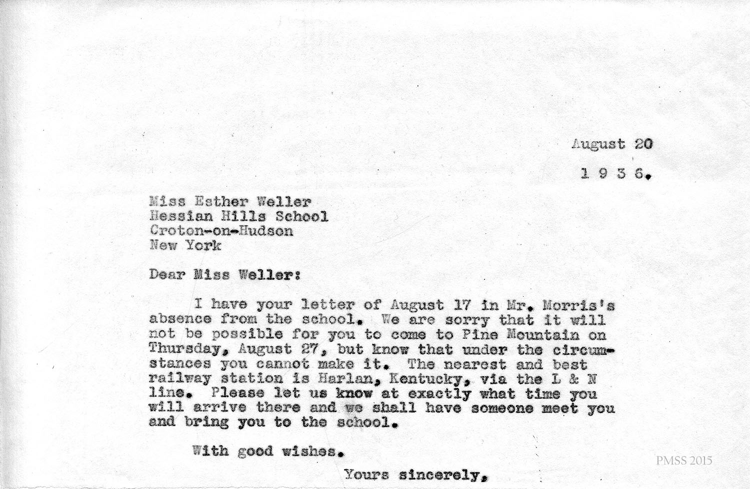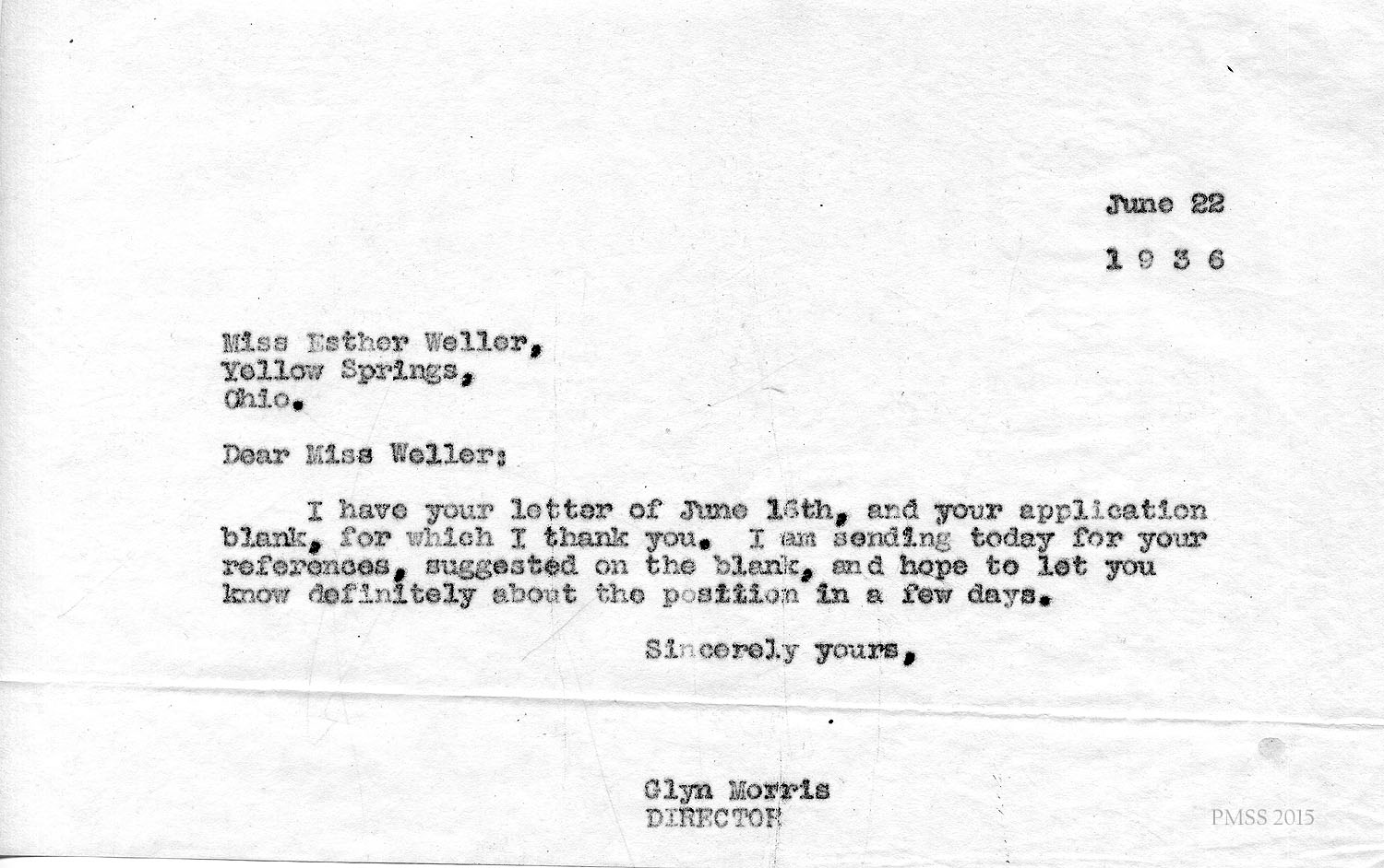 I am enclosing the credentials for Esther Weller, one of our senior girls who is applying for Georgia Thomas’s position at Pine Mountain. You will notice that Miss Weller has had a varied experience on her co-operative work. All of these positions, at the Ohio Soldiers’ and Sailors’ Orphans’ Home, and the Children’s Village, and Hessian Hills, have been with children. She has worked with children from kindergarten age through sixth and seventh grades. Her training at St. Joseph Junior College, which was largely in education, dealt with junior high school work. She has, therefore, had a good variety of background and training for such a position as you have to offer at Pine Mountain.