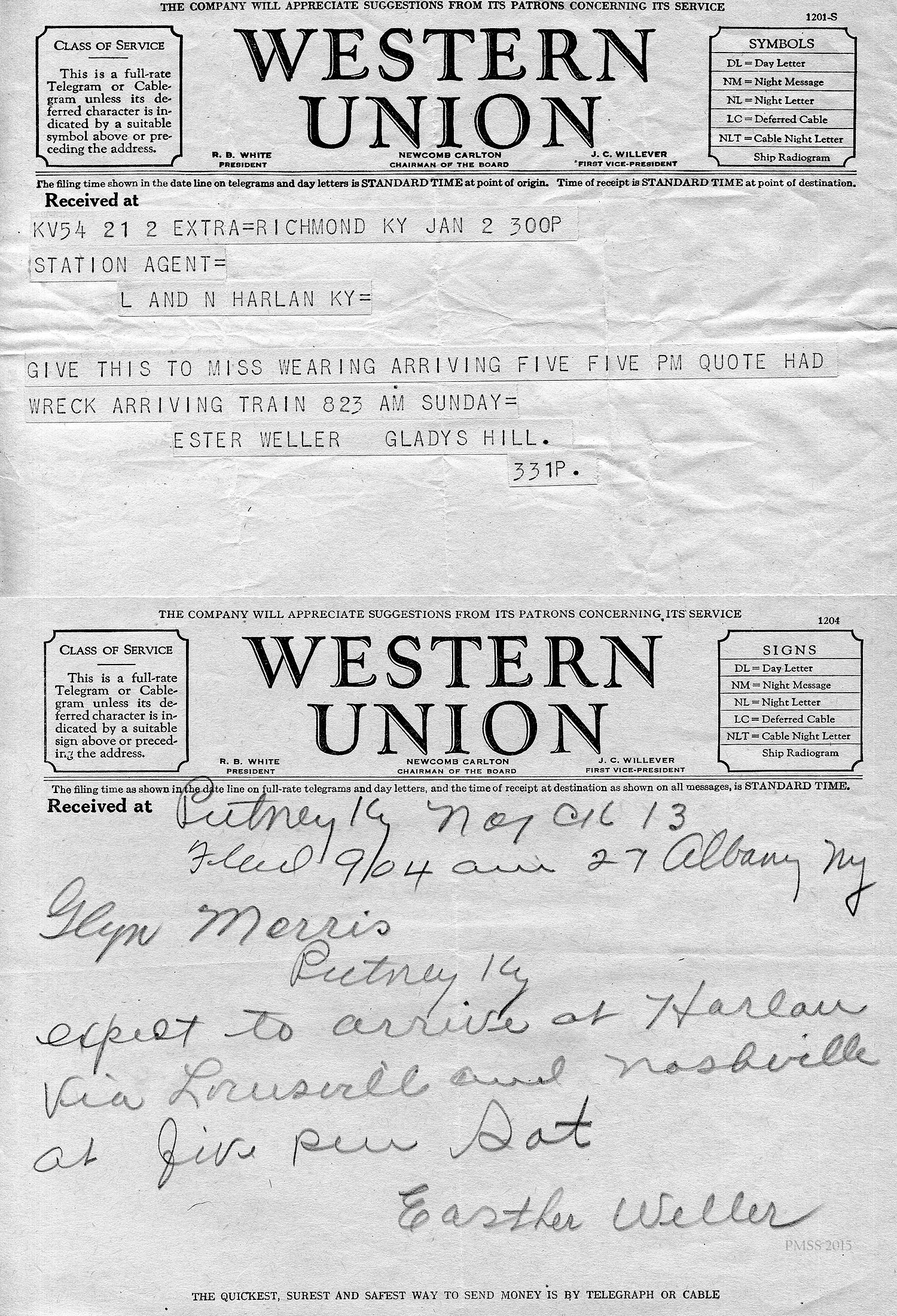 GIVE THIS TO MISS WEARING ARRIVING FIVE FIVE PM QUOTE HAD WRECK ARRIVING TRAIN 823 AM SUNDAY=