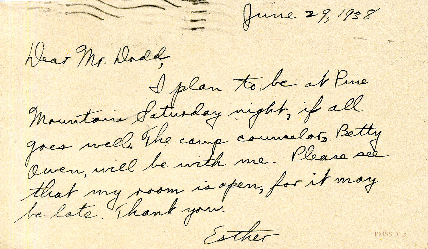 I plan to be at Pine Mountain Saturday night, if all goes well. The camp counselor, Betty Owen, will be with me. Please see that my room is open, for it may be late. Thank you.