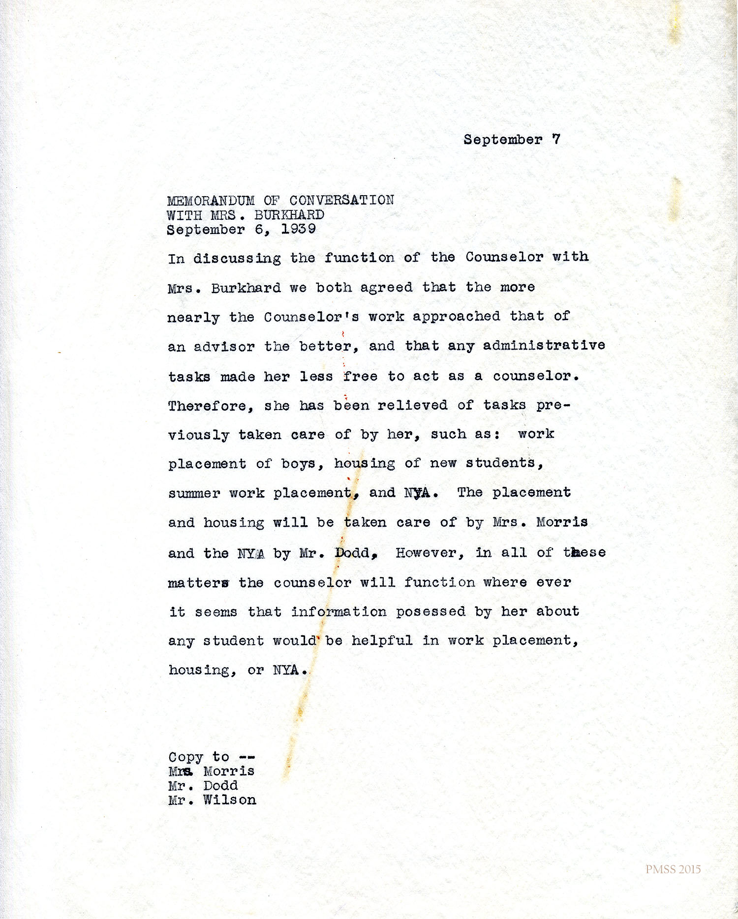 In discussing the function of the Counselor with Mrs. Burkhard we both agreed that the more nearly the Counselor’s work approached that of an advisor the better, and that any administrative tasks made her less free to act as a counselor. Therefore, she has been relieved of tasks previously taken care of by her, such as: work placement of boys, housing of new students, summer work placement, and NYA. The placement and housing will be taken care of by Mrs. Morris and the NYA by Mr. Dodd. However, in all of these matters the counselor will function where ever it seems that information possessed by her about any student would be helpful in work placement, housing, or NYA.