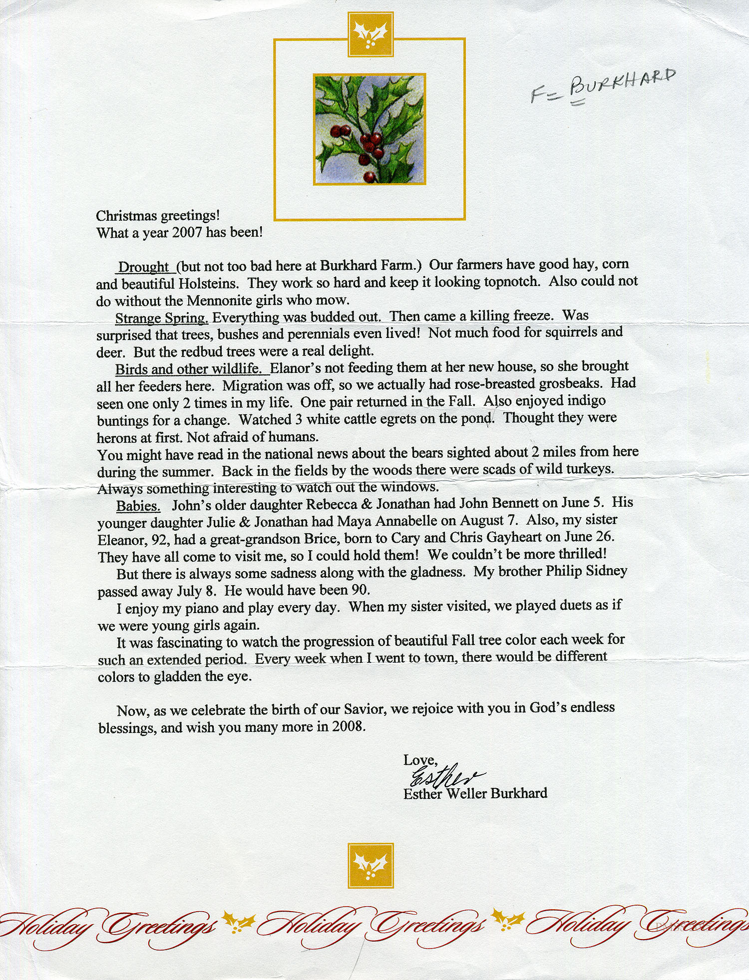 [weller_e_030.jpg] [Christmas letter of 2007 with news from Esther Burkhard about home life and family, including her brothers, sister, children and grandchildren.]
