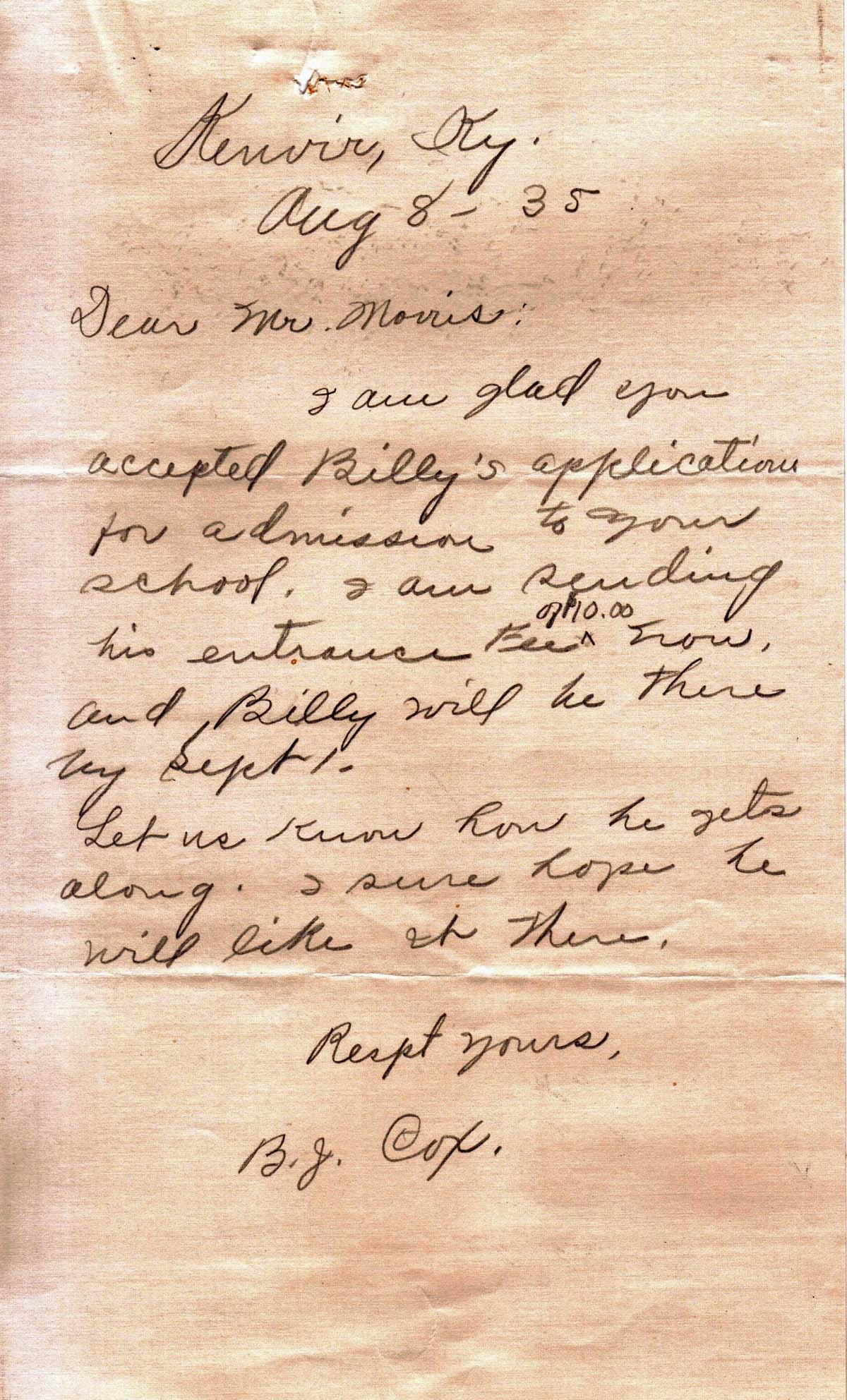 I am glad you accepted Billy’s application for admission to your school. I am sending his entrance fee of $10.00 now, and Billy will be there by Sept 1. Let us know how he gets along. I sure hope he will like it there.