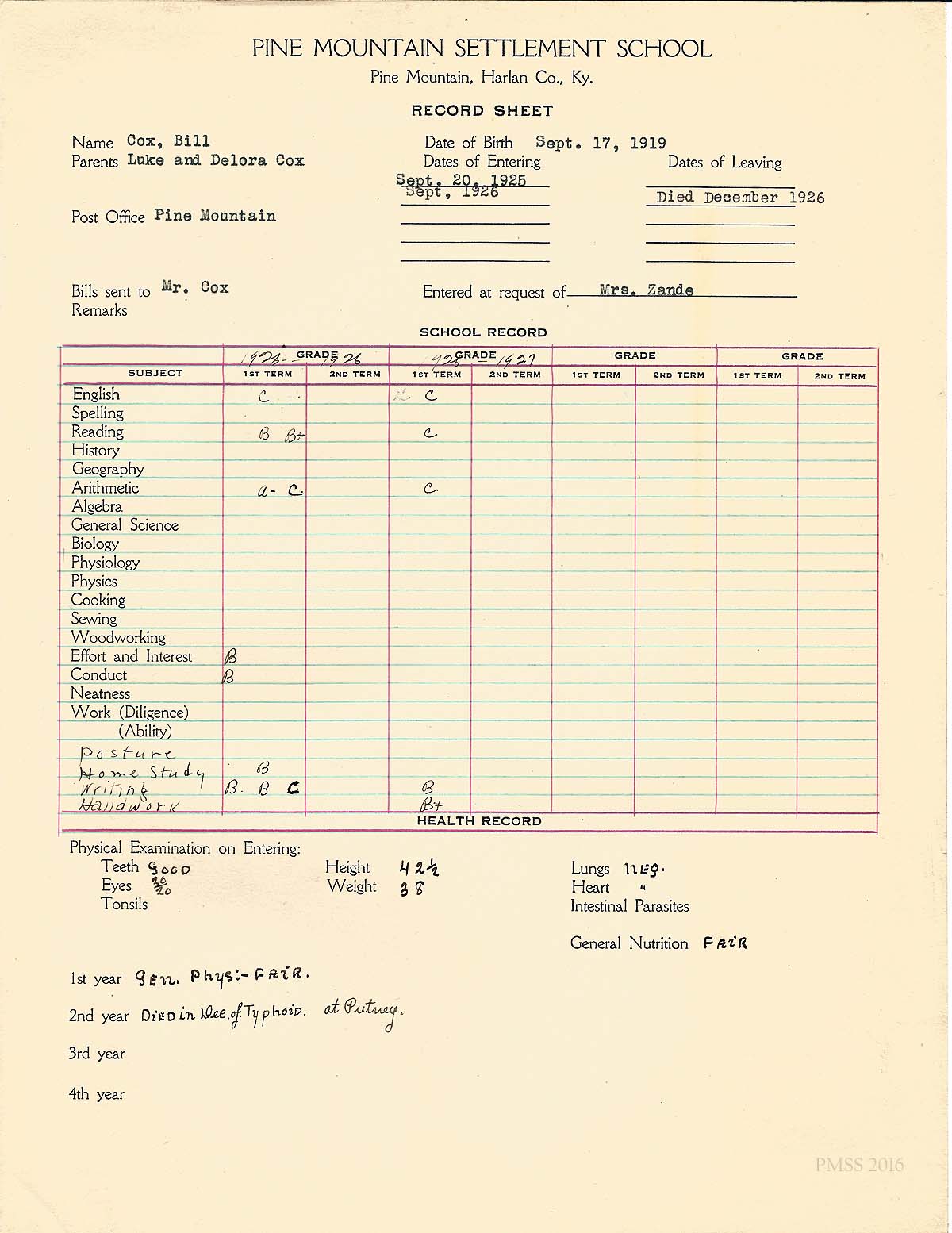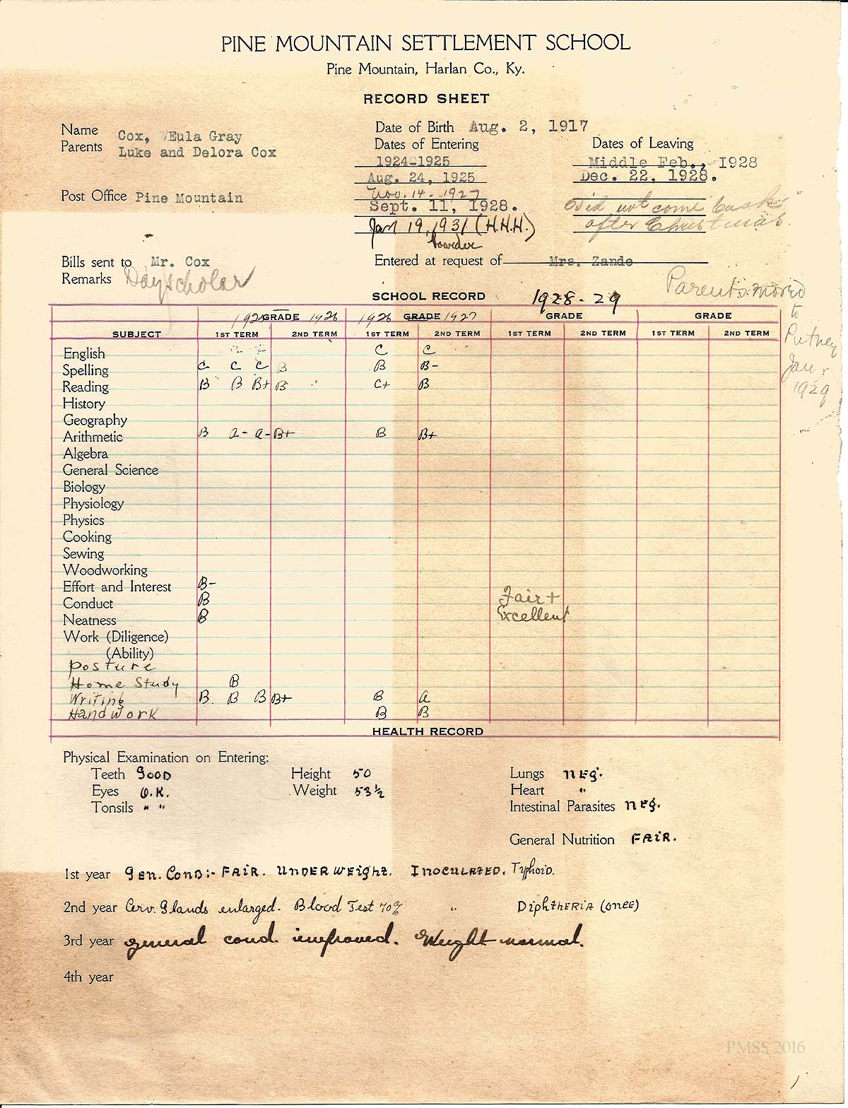 TAGS: Eula Gray Cox and Billy Cox Correspondence 1925-1936, Mr. & Mrs. Lucas C. Cox, school and health records, character development reports, reservation forms, tuition bills, typhoid, permission slips, tonsils
