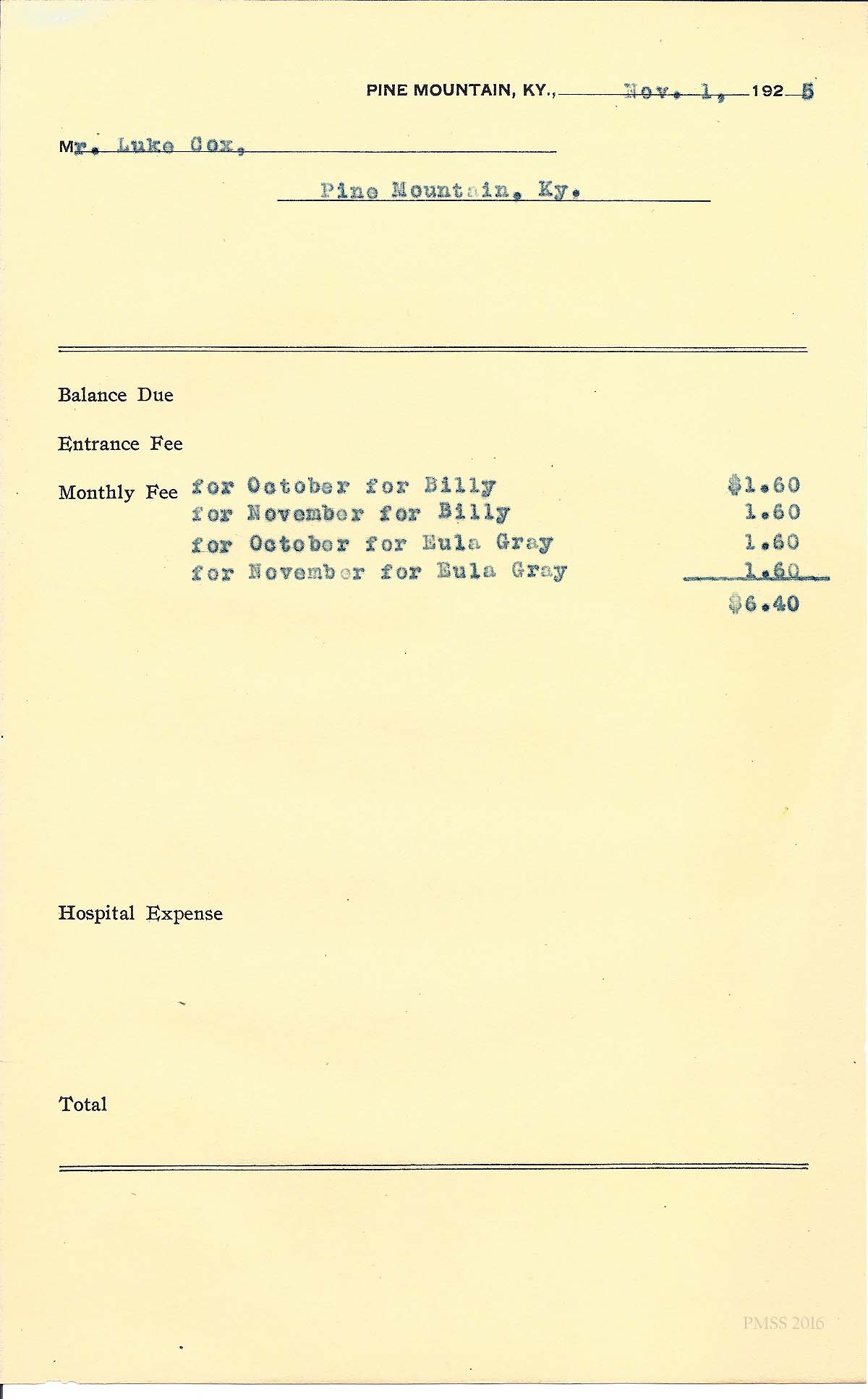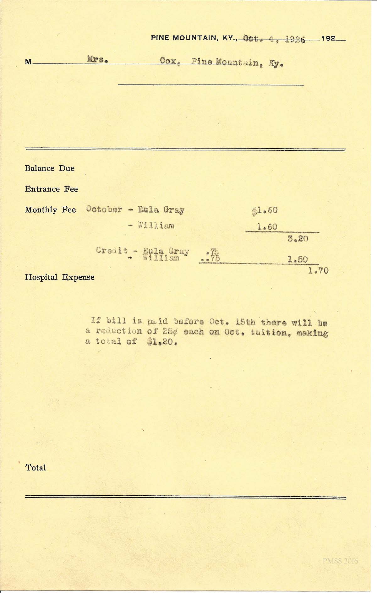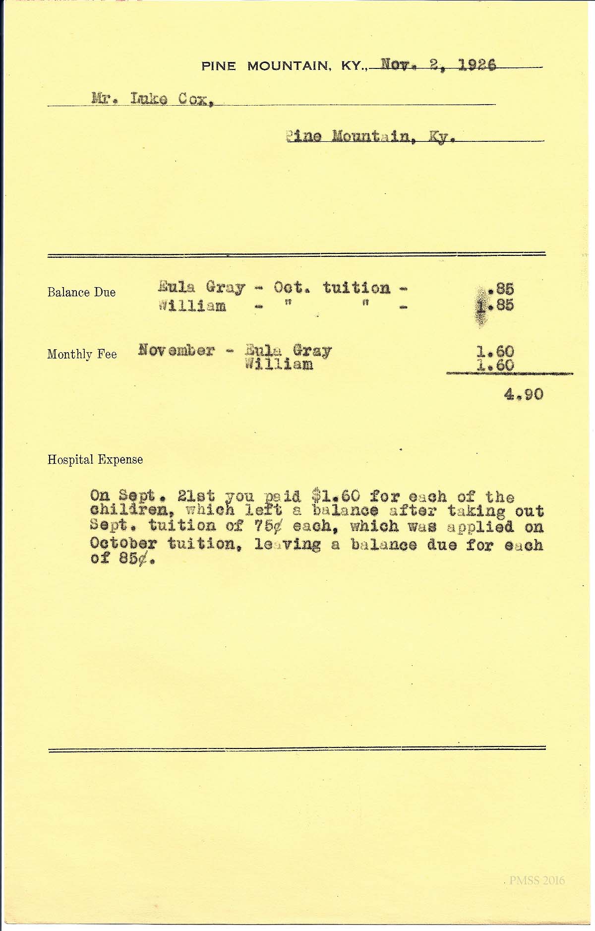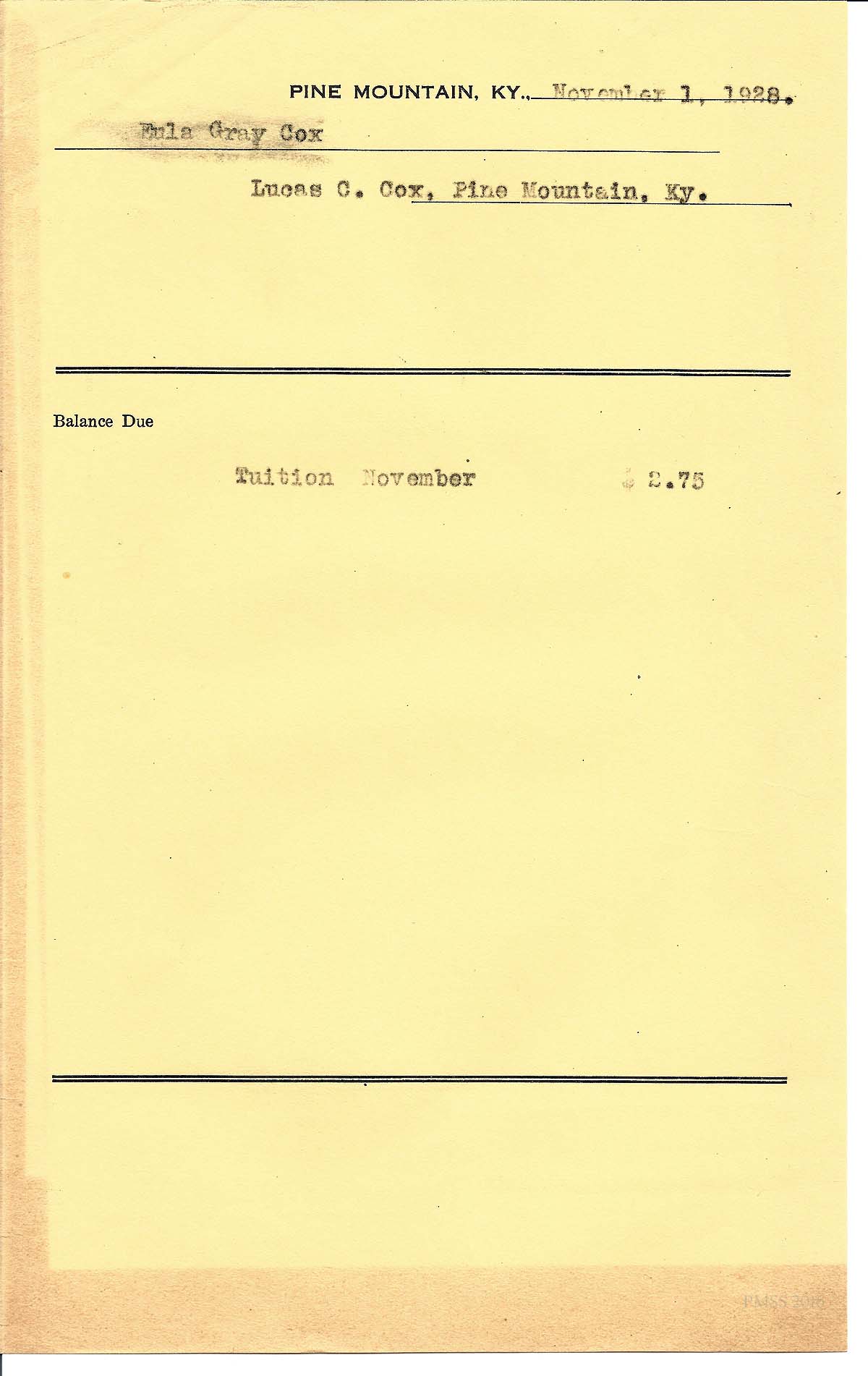 [cox_e_0015.jpg] PMSS tuition bill with carbon copy of typewritten entries for “Eula Gray” and “William.” Dated Nov. 2, 1926.