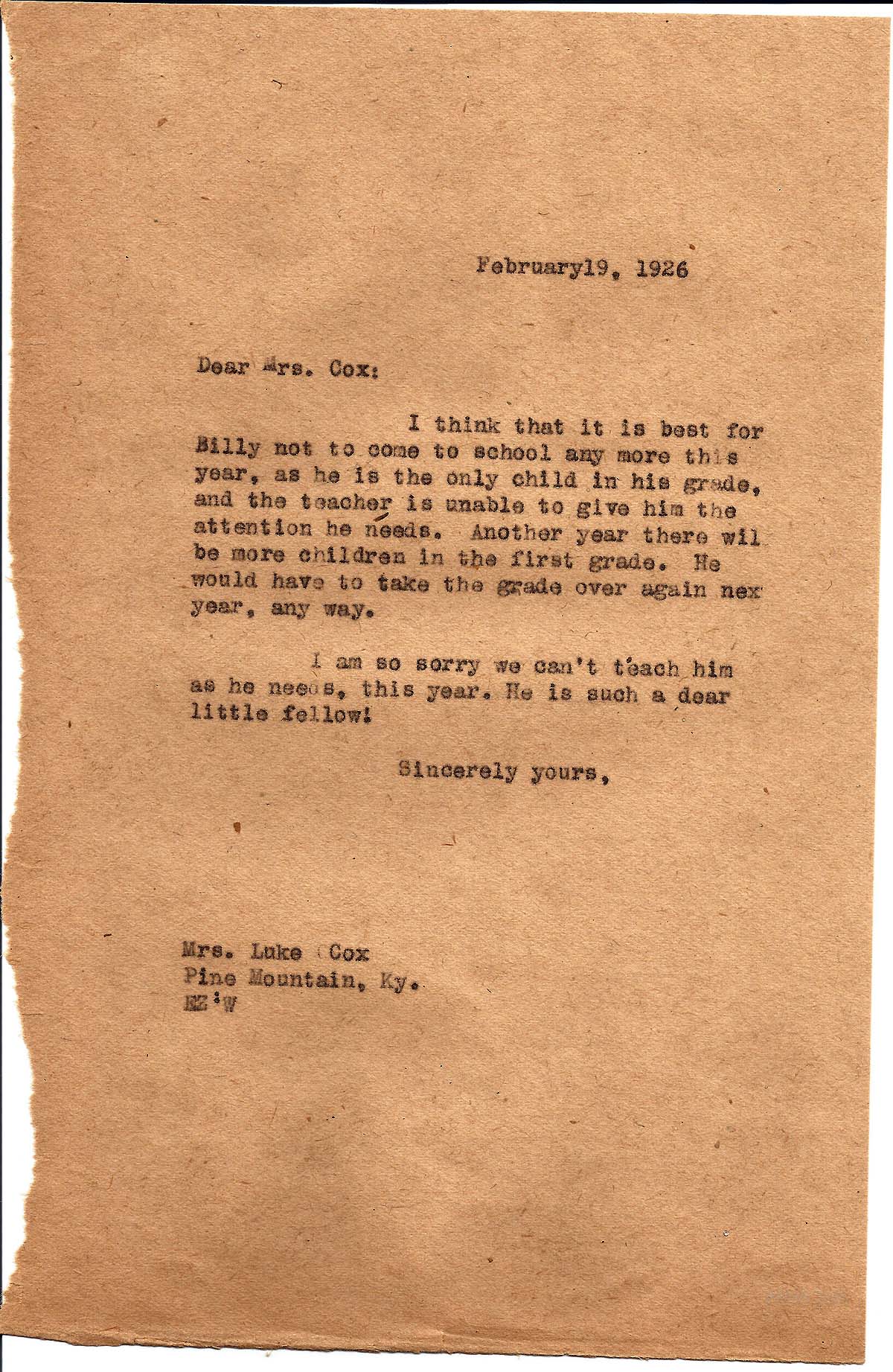 I think that it is best for Billy not to come to school any more this year, as he is the only child in his grade, and the teacher is unable to give him the attention he needs. Another year there will be more children in the first grade. He would have to take the grade over again next year, anyway.