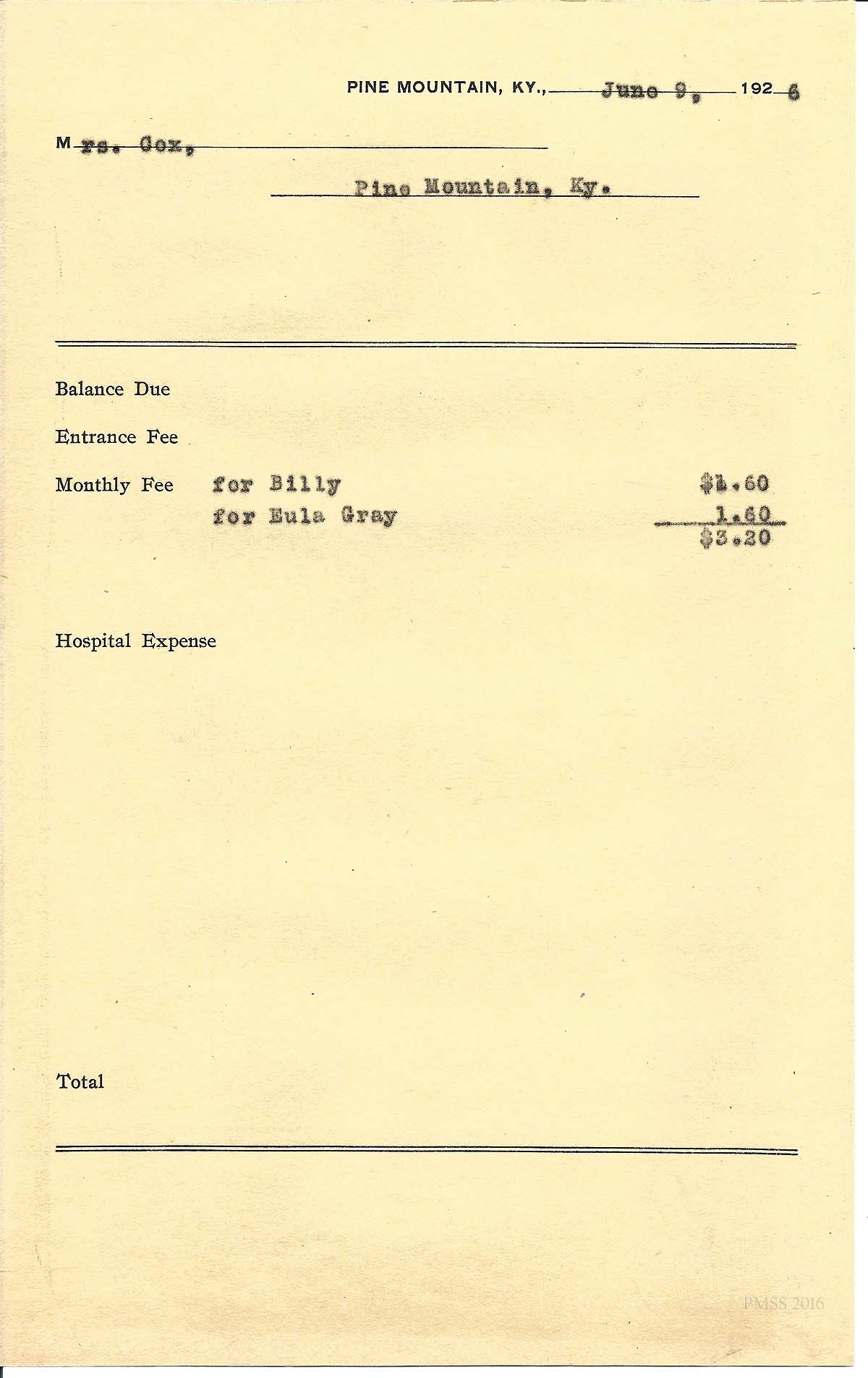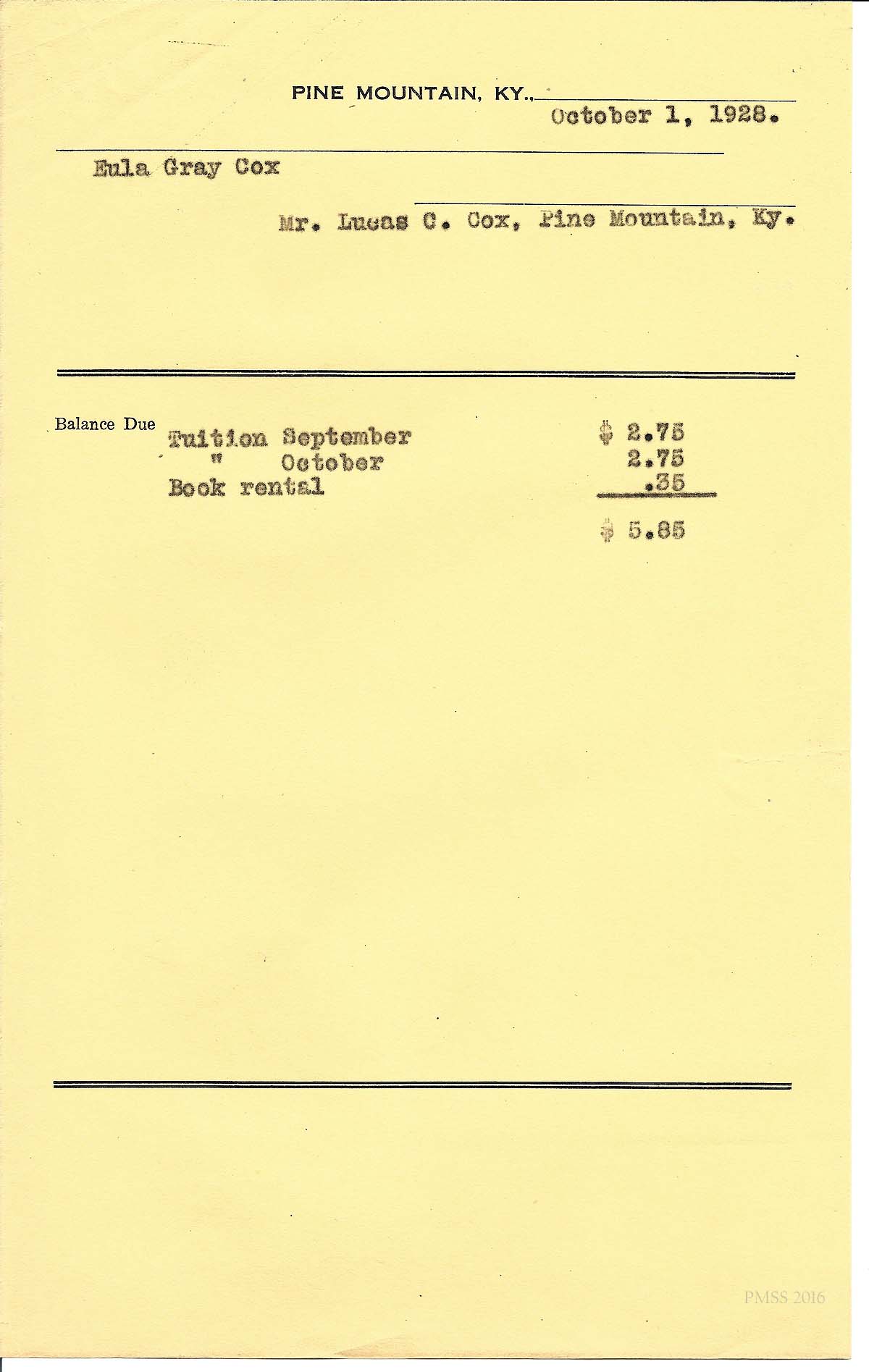 [cox_e_0011.jpg] PMSS tuition bill with carbon copy of typewritten entries for “Billy” and “Eula Gray.”