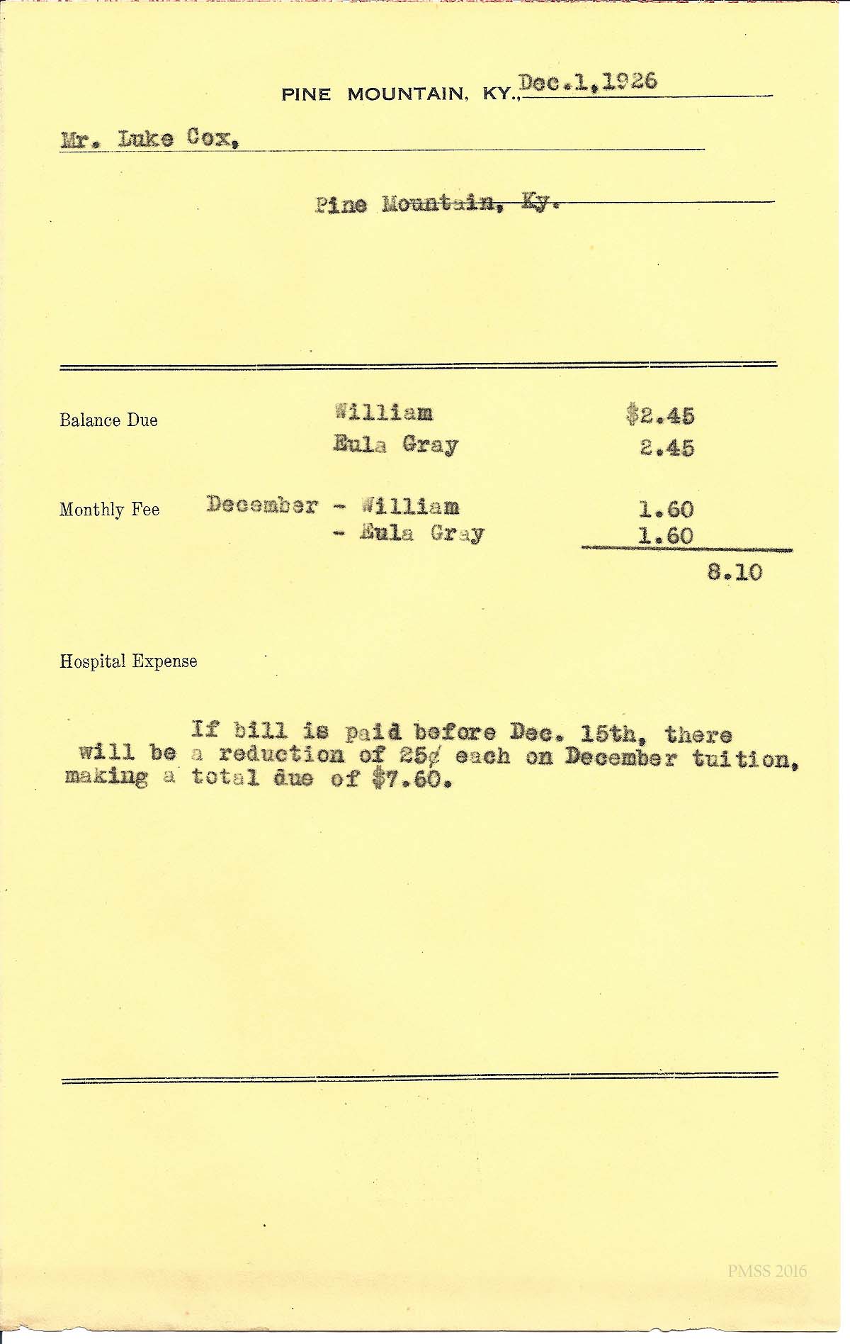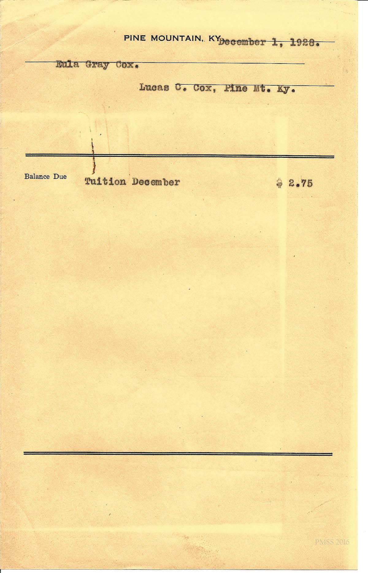 [cox_e_0016.jpg] PMSS tuition bill with carbon copy of typewritten entries for “Eula Gray” and “William.” Dated Dec. 1, 1926.
