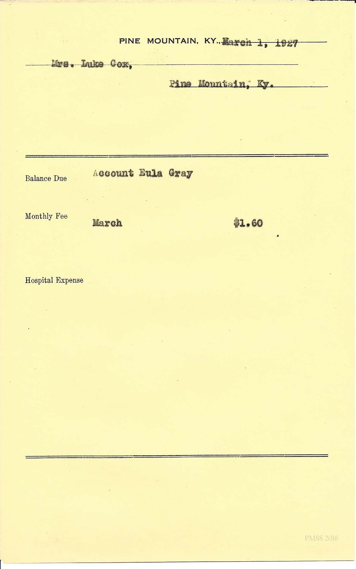 [cox_e_0025.jpg] PMSS tuition bill with carbon copy of typewritten entries for “Eula Gray Cox.” Dated March 1, 1931.