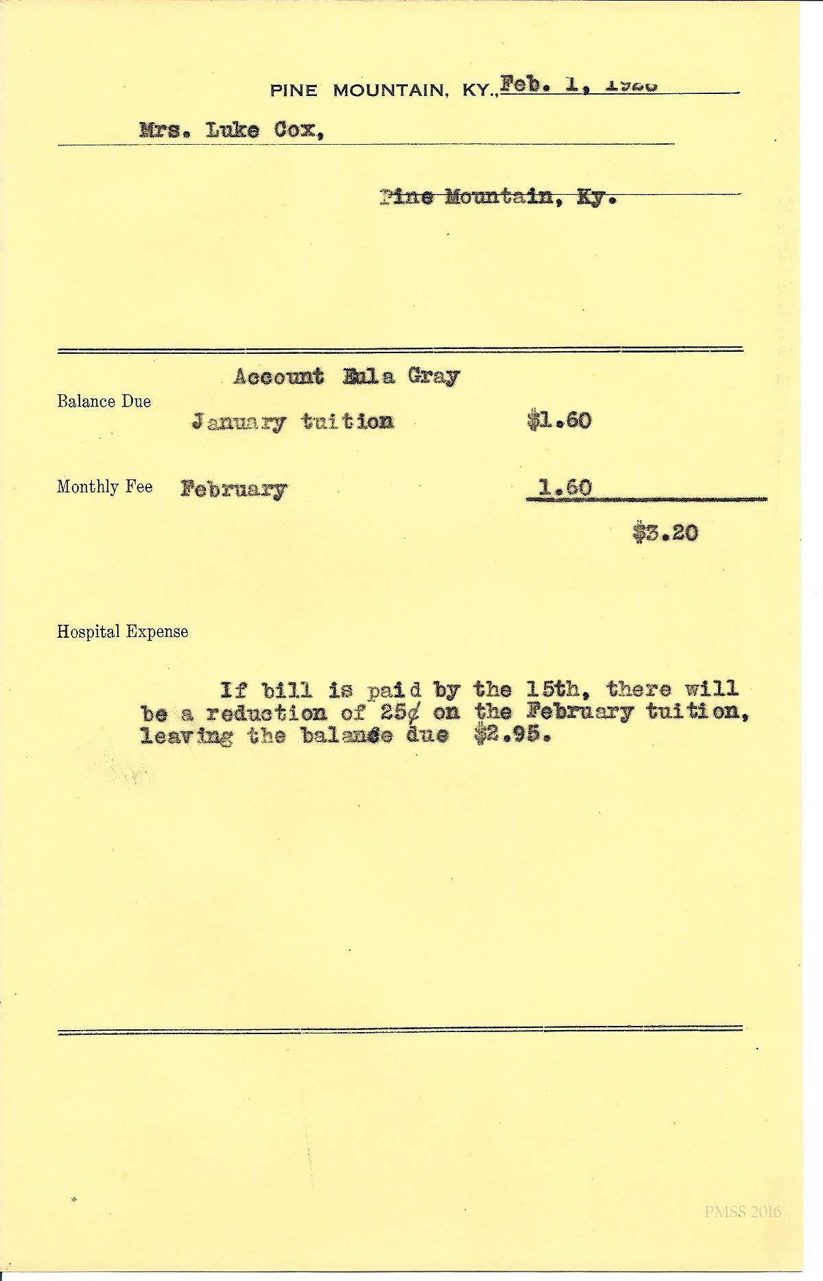 [cox_e_0014.jpg] PMSS tuition bill with carbon copy of typewritten entries for “Eula Gray” and “William.”