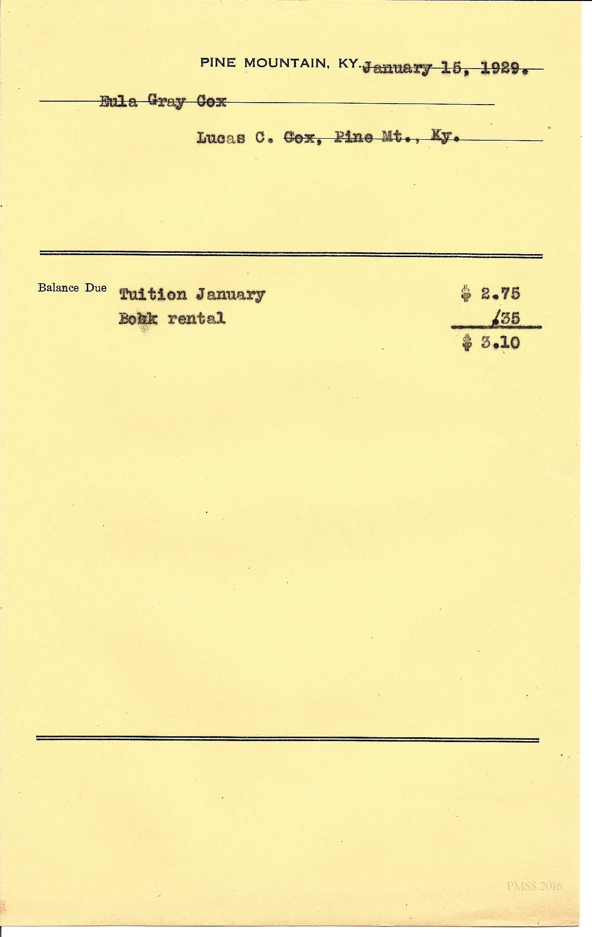 [cox_e_0023.jpg] PMSS tuition & book rental bill with carbon copy of typewritten entries for “Eula Gray Cox.” Dated January 15, 1929.