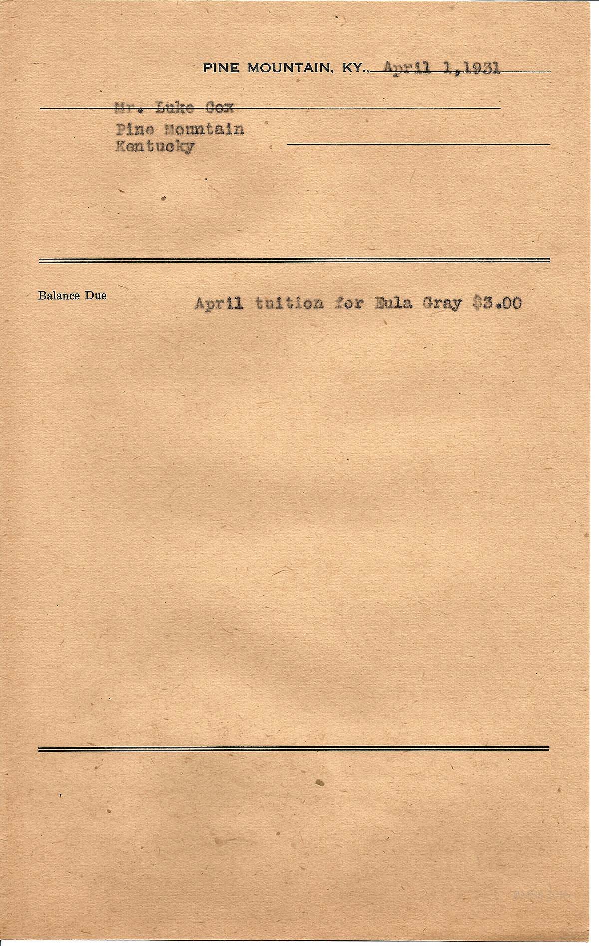 [cox_e_0026.jpg] PMSS tuition bill with carbon copy of typewritten entries for “Eula Gray Cox.” Dated April 1, 1931.