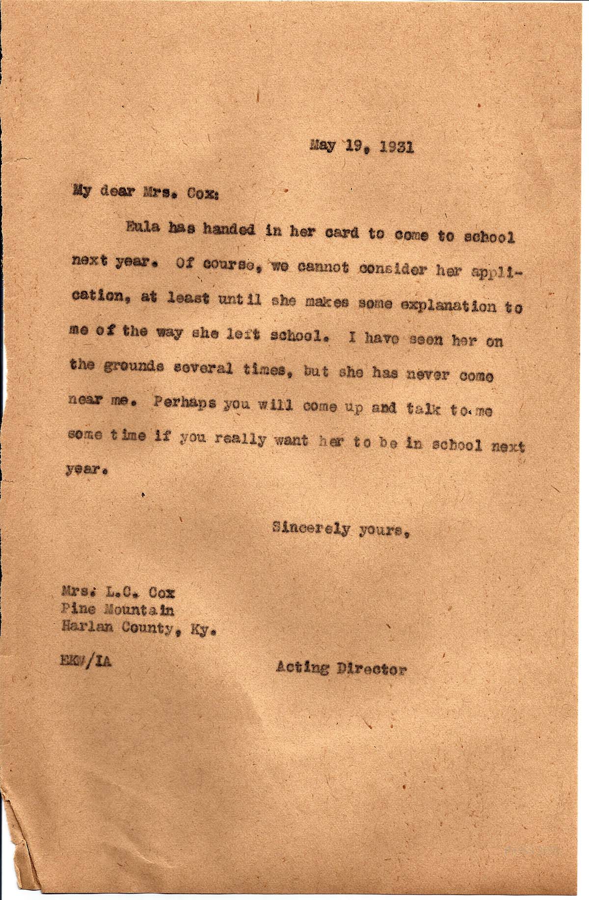 Eula has handed in her card to come to school next year. Of course, we cannot consider her application, at least until she makes some explanation to me of the way she left school. I have seen her on the grounds several times, but she has never come near me. Perhaps you will come up and talk to me some time if you really want her to be in school next year.