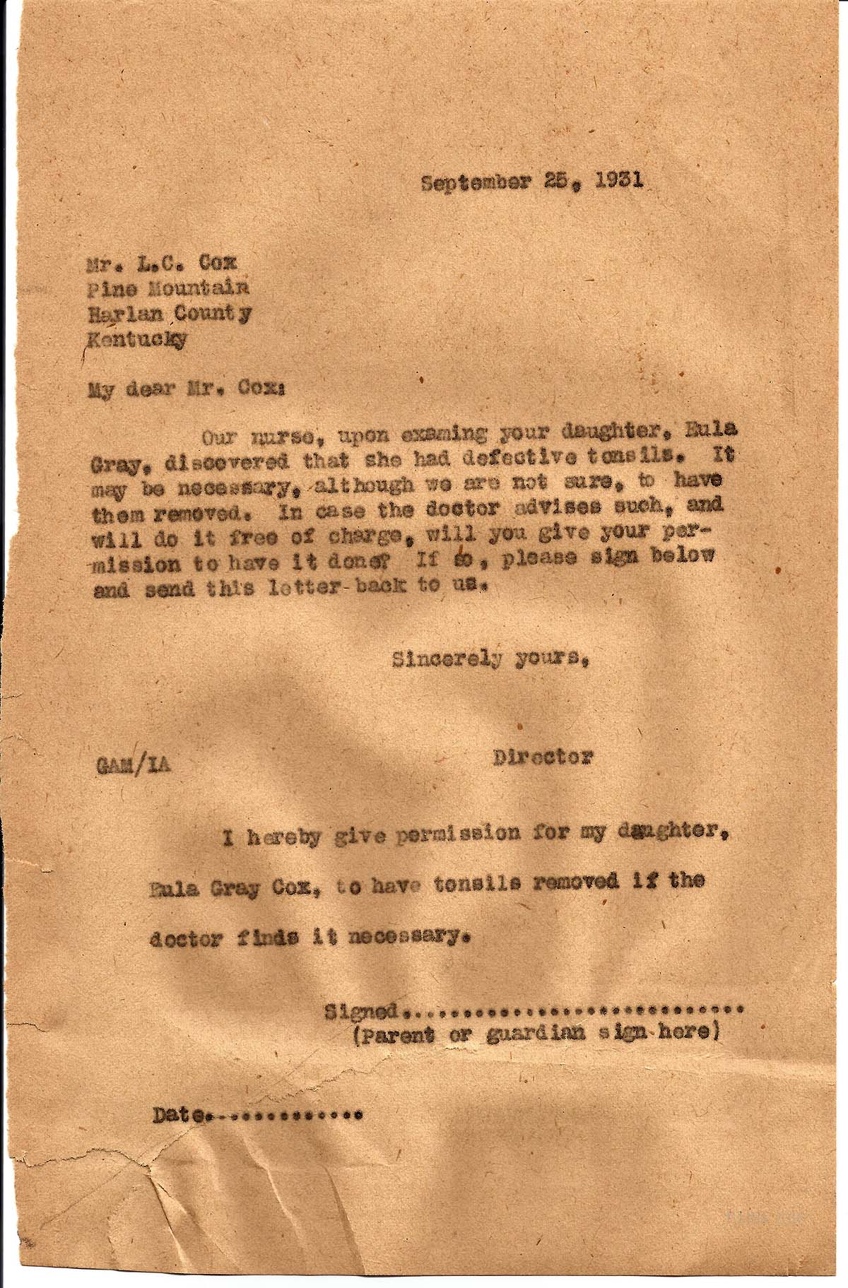 Our nurse, upon examining your daughter, Eula Gray, discovered that she had defective tonsils. It may be necessary, although we are not sure, to have them removed. In case the doctor advises such, and will do it free of charge, will you give your permission to have it done? If so, please sign below and send this letter back to us.