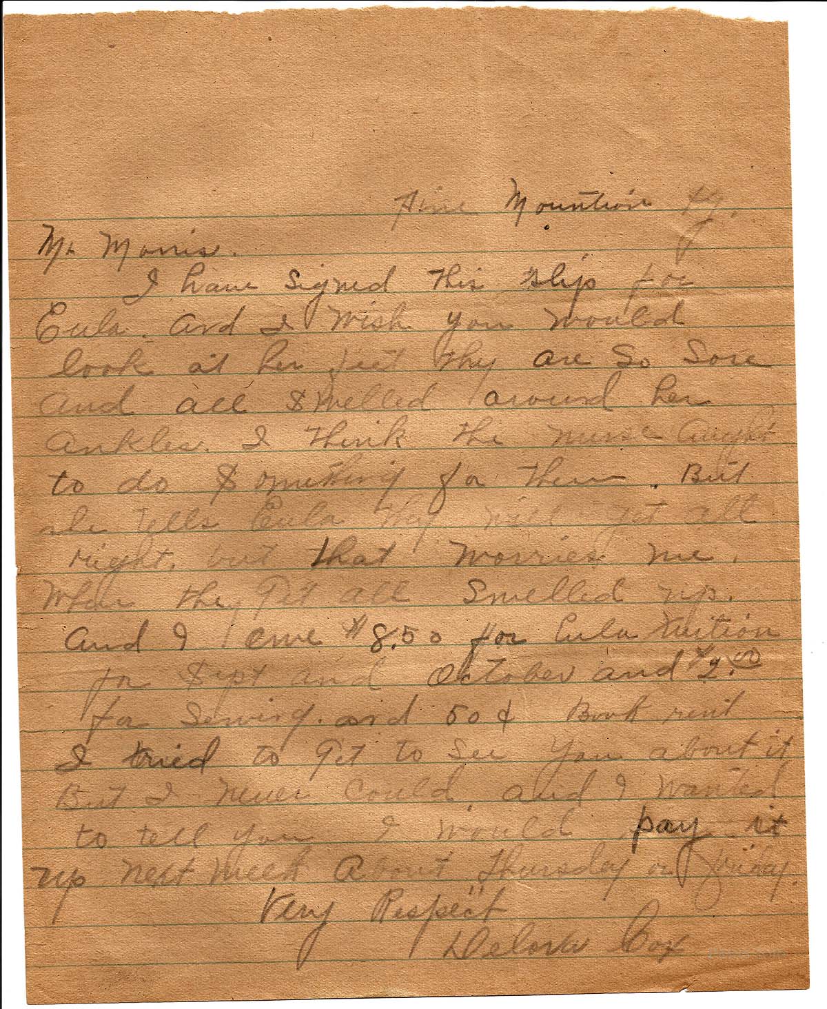And I owe $8.50 for Eula’s tuition for Sept and October and $2.30 for sewing and $.50 book rent. I tried to get to see you about it but I never could and I wanted to tell you I would pay it up next week about Thursday or Friday.
