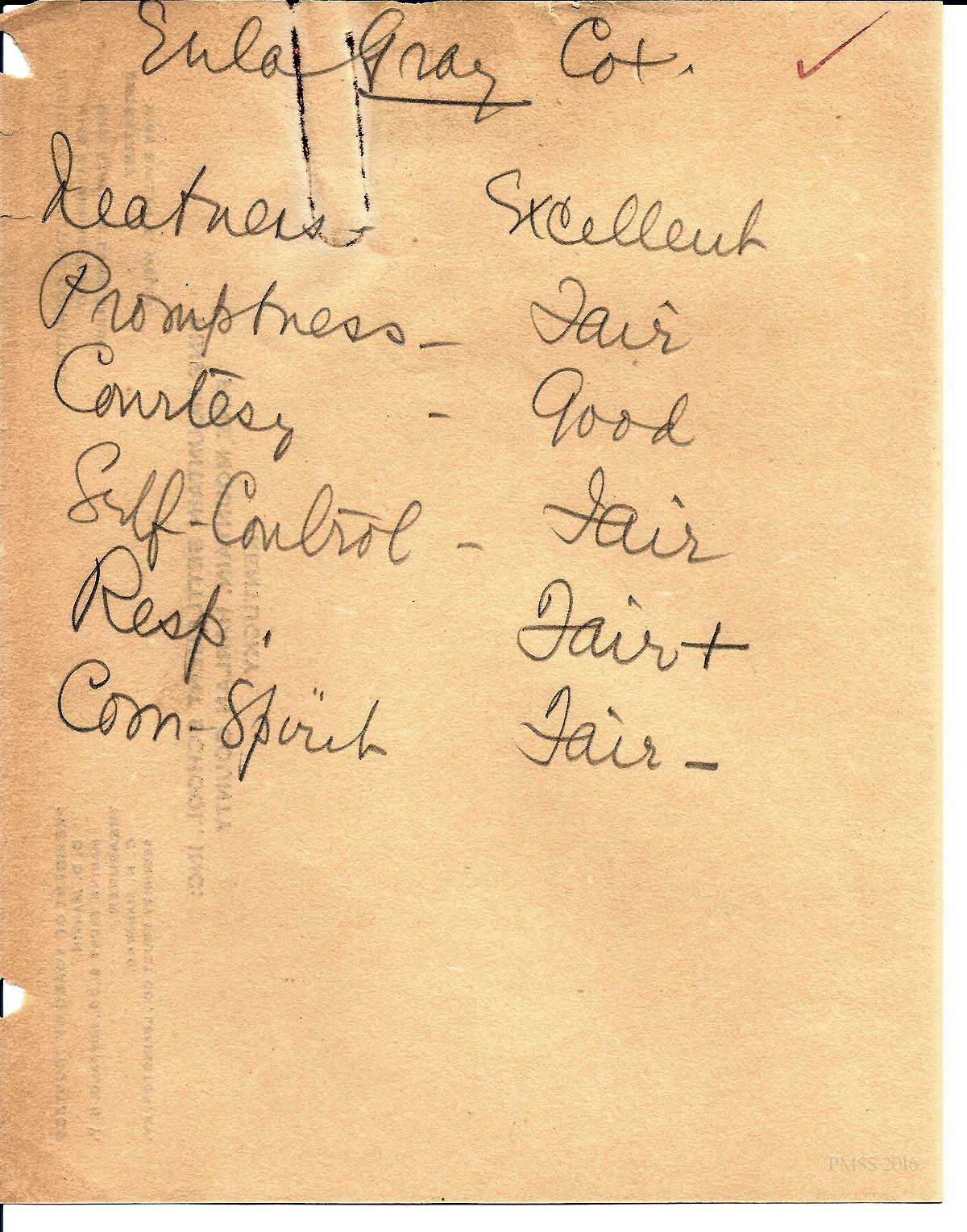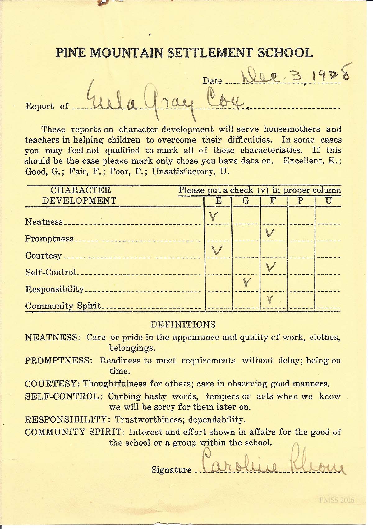[cox_e_006.jpg] PMSS report on character development with handwritten entries for “Eula Gray Cox.’