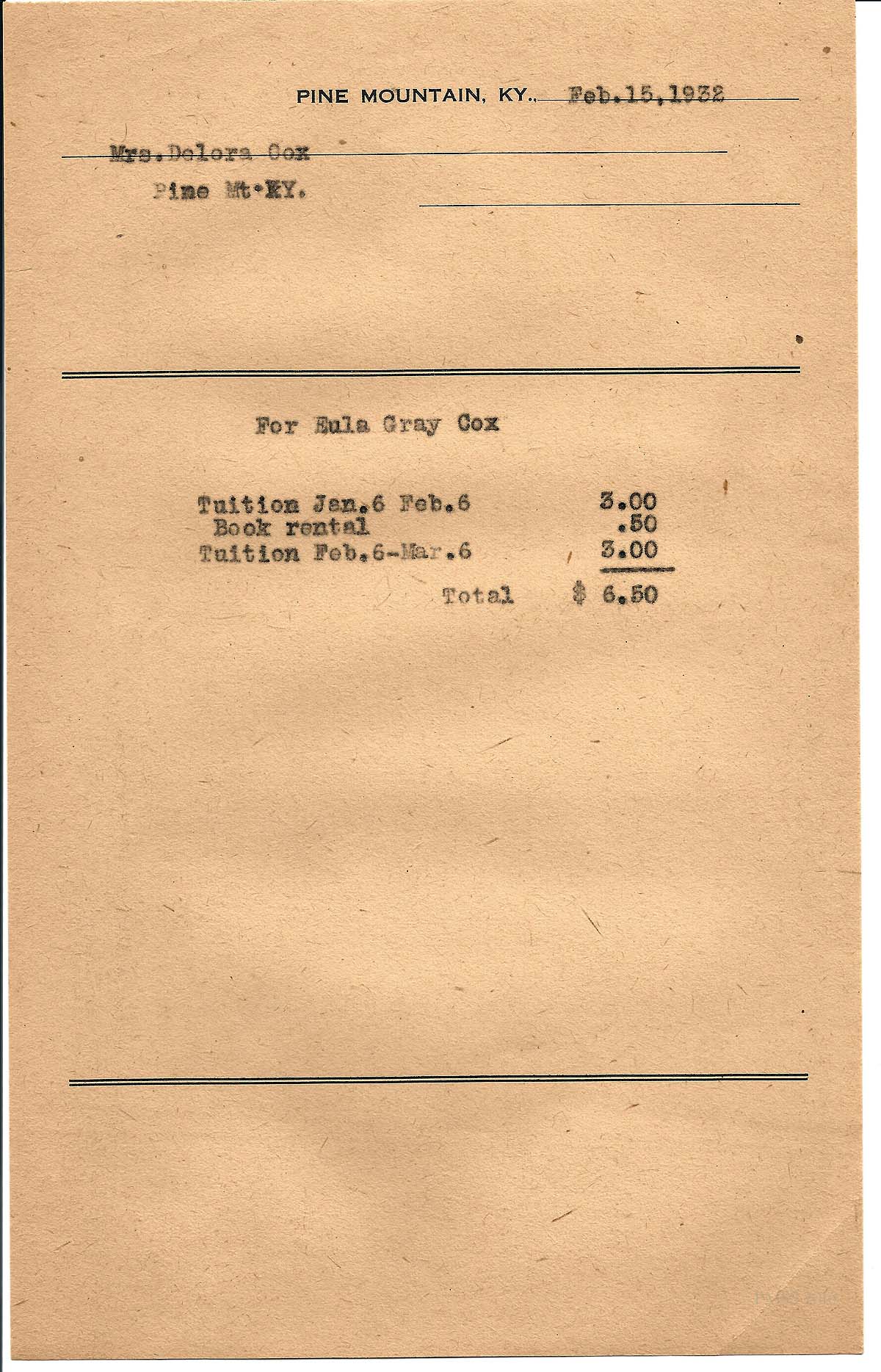 [cox_e_0030.jpg] PMSS tuition & book rental bill with carbon copy of typewritten entries for “Eula Gray Cox.” dated Feb. 15, 1932.