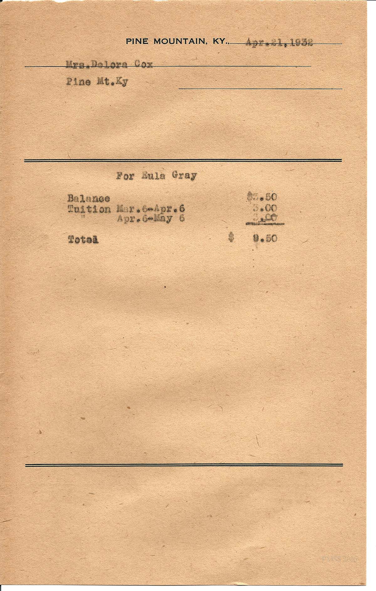 [cox_e_0031.jpg] PMSS tuition bill with carbon copy of typewritten entries for “Eula Gray.” Dated Apr. 21, 1932.