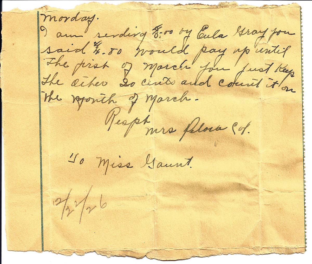 I am sending $5.00 by Eula Gray. You said $4.80 would pay up until the first of March. You just keep the other 20 cents and count it on the month of March.