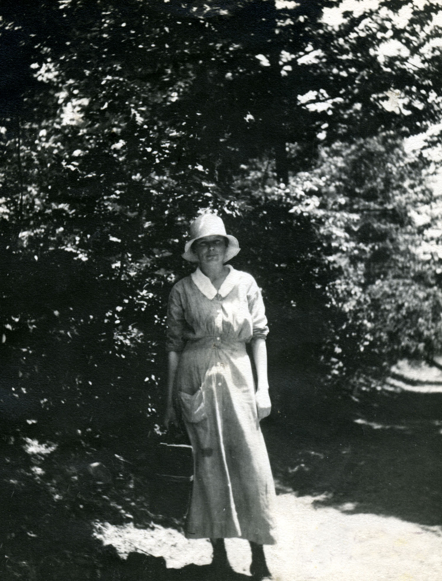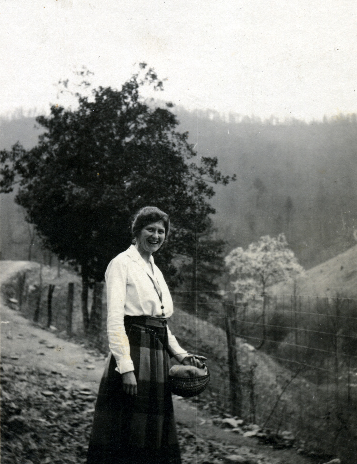 - Evelyn K. Wells at the Medical Settlement, Big Laurel. She is holding a woven hickory basket. [X_099_workers_2526d_mod.jpg]