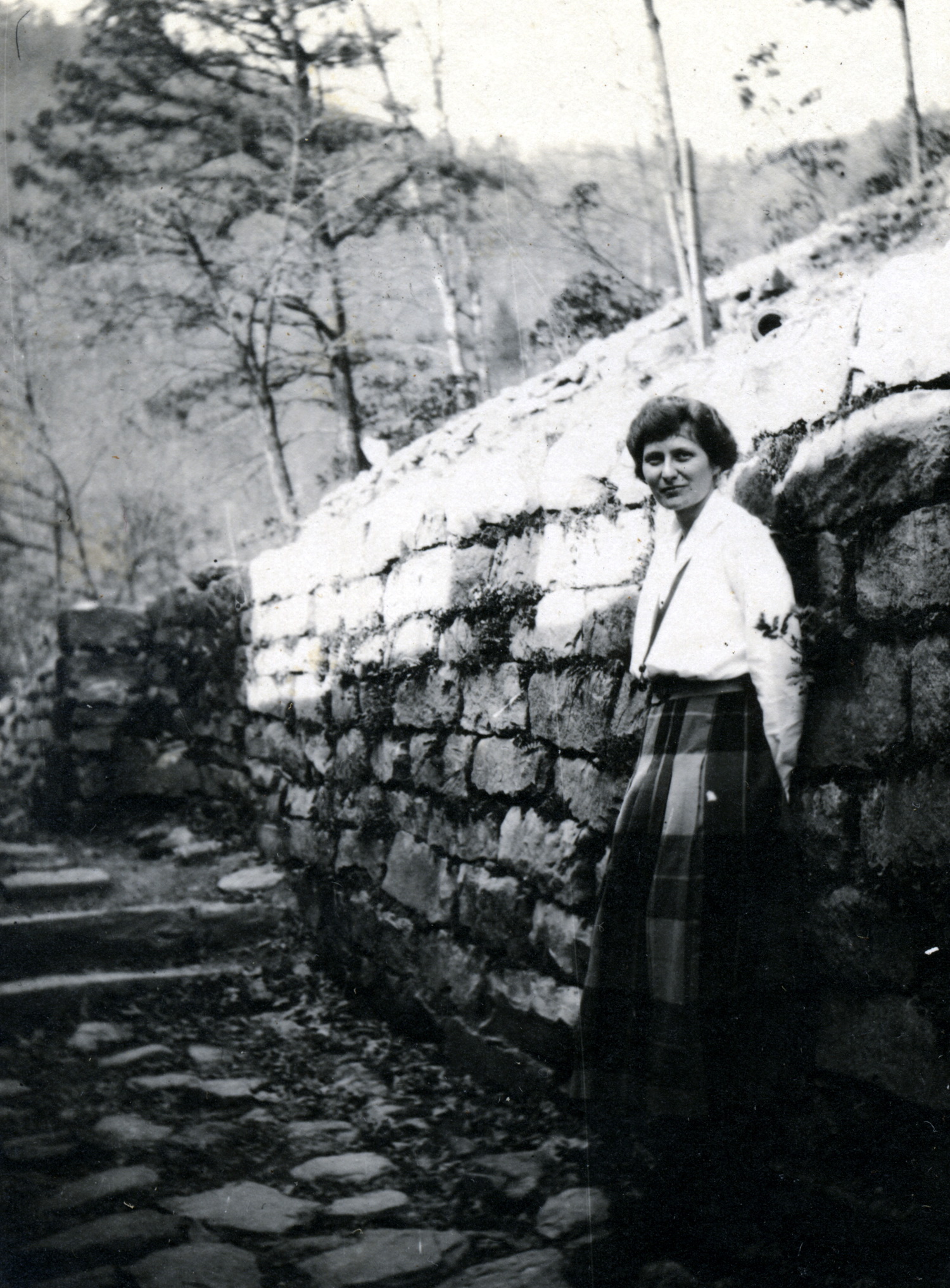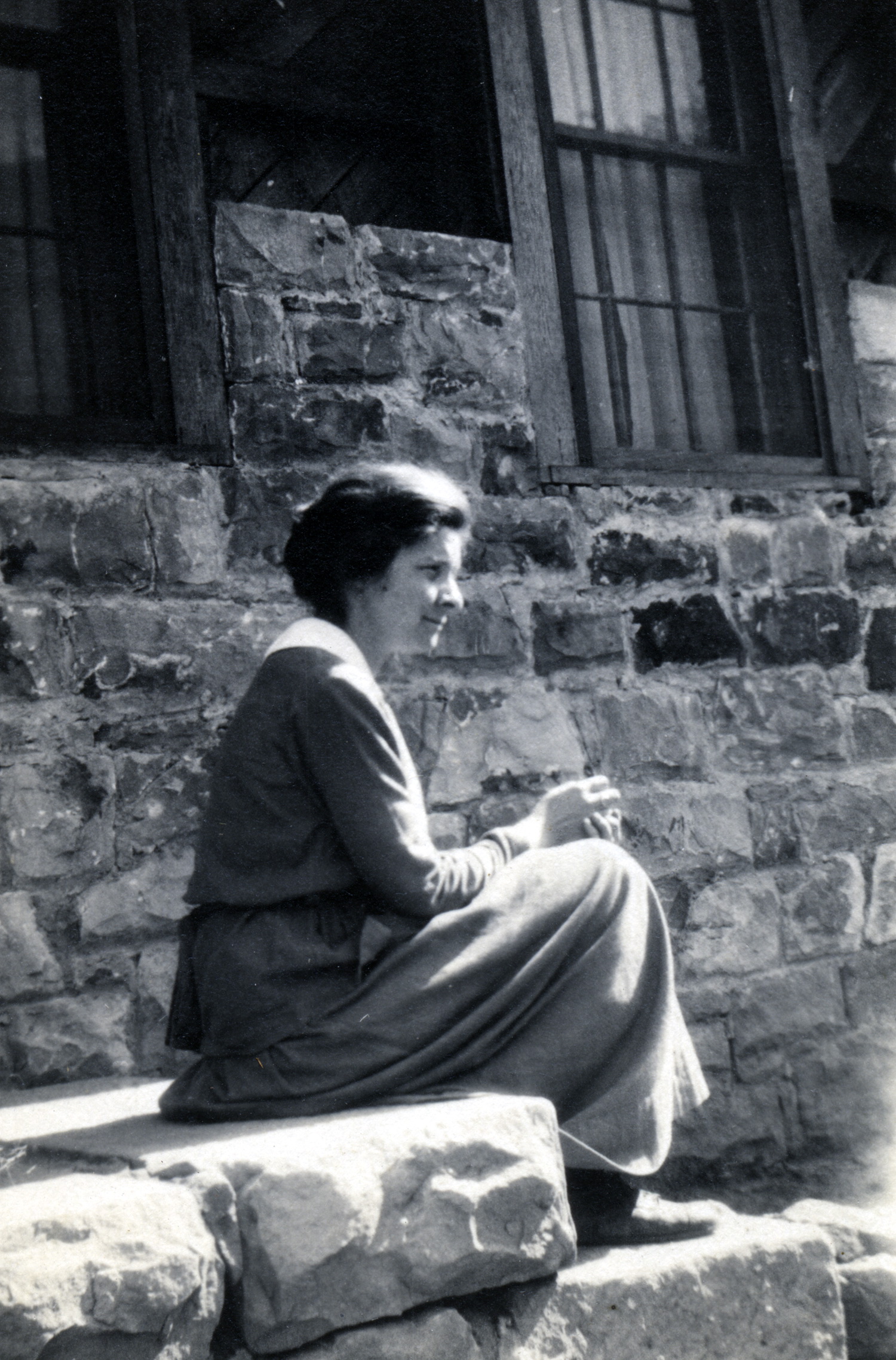 - Evelyn K. Wells leaning against stone wall at the Medical Settlement , Big Laurel. [X_099_workers_2526b_mod.jpg]