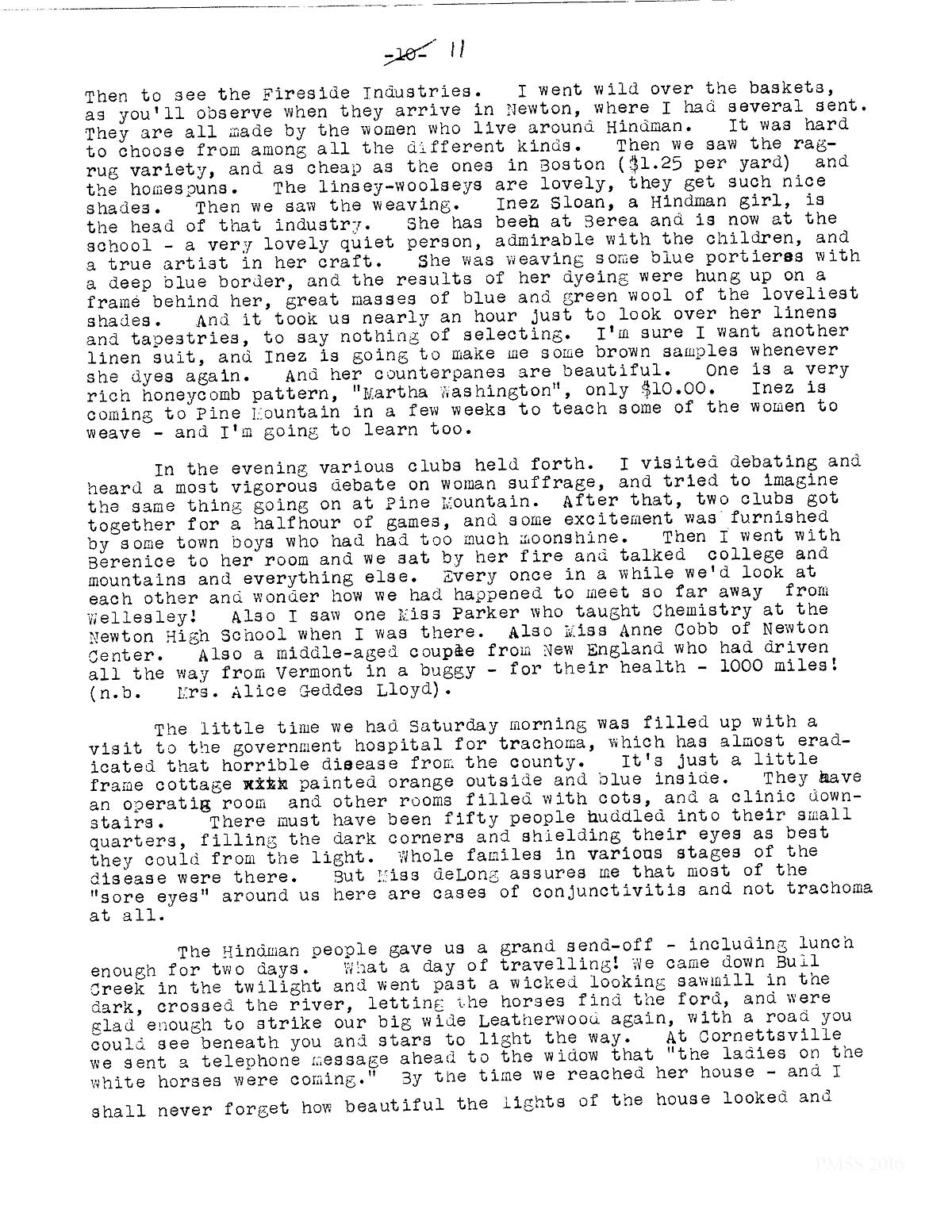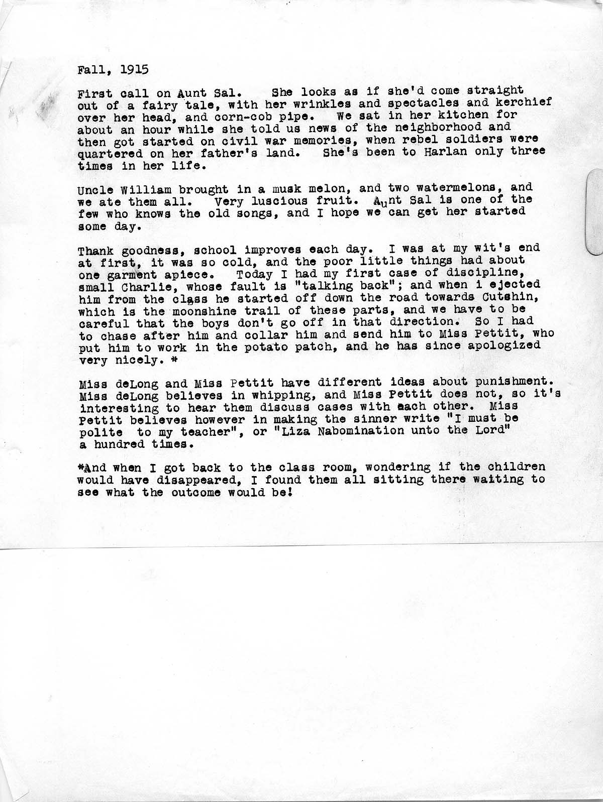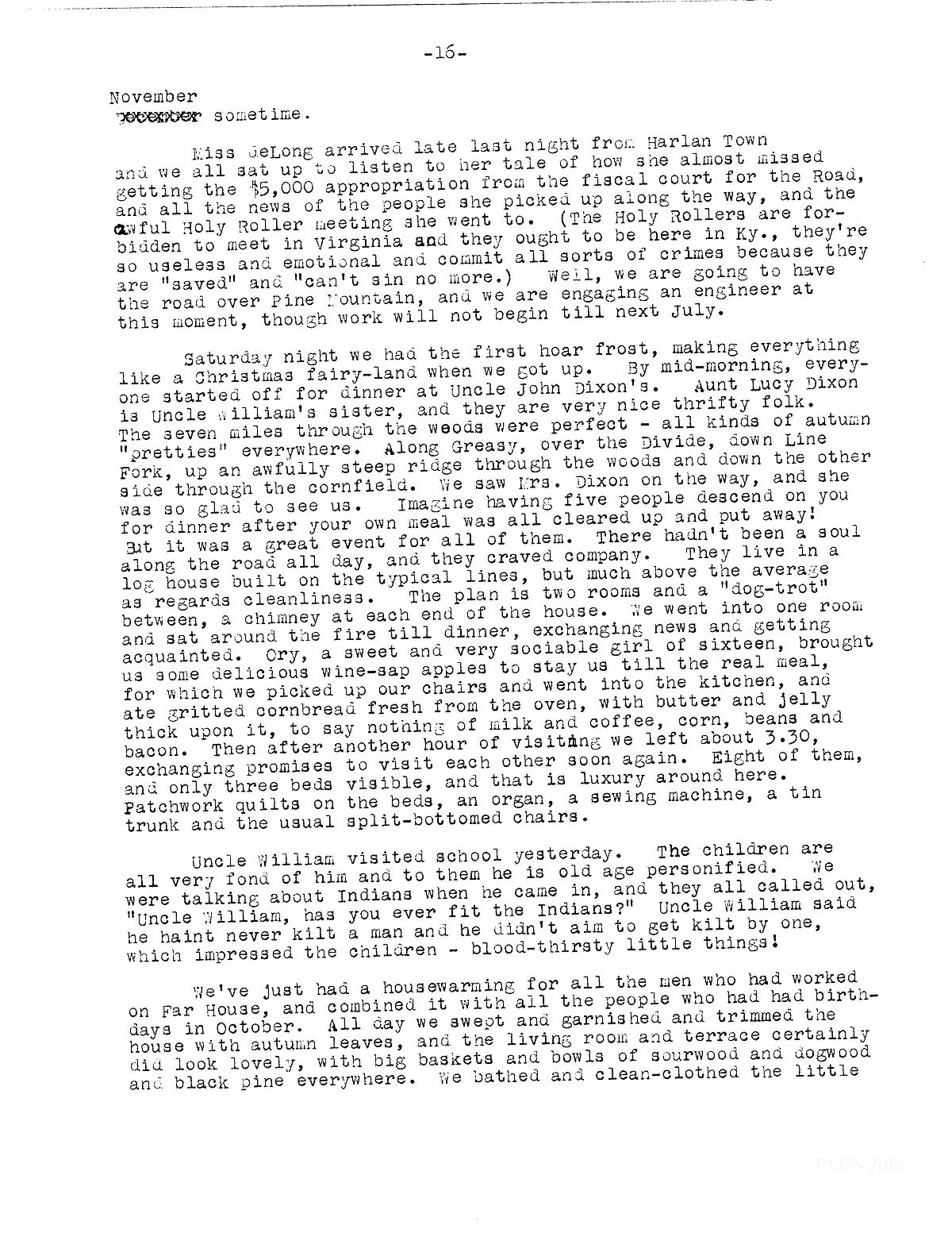 1915 November, sometime. Miss de Long arrived late last night from Harlan Town and we all sat up to listen to her tale of how she almost missed getting the $5,000 appropriation from the fiscal court for the Road and all the news of the people she picked up along the way, …. (p.16-17)